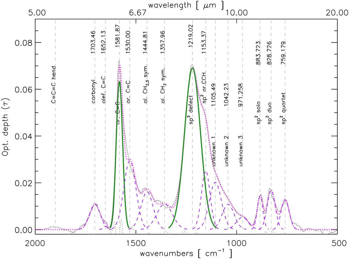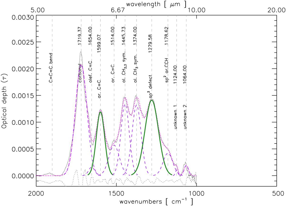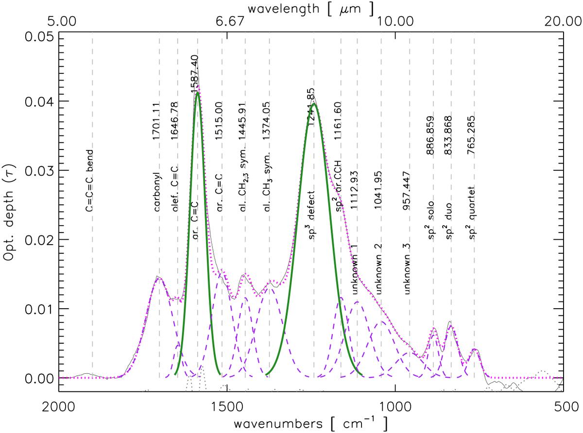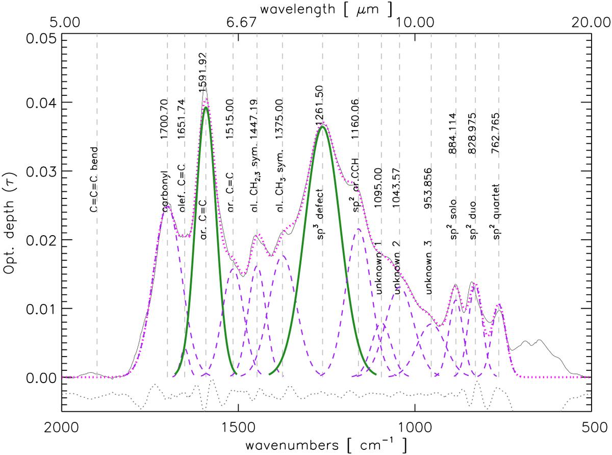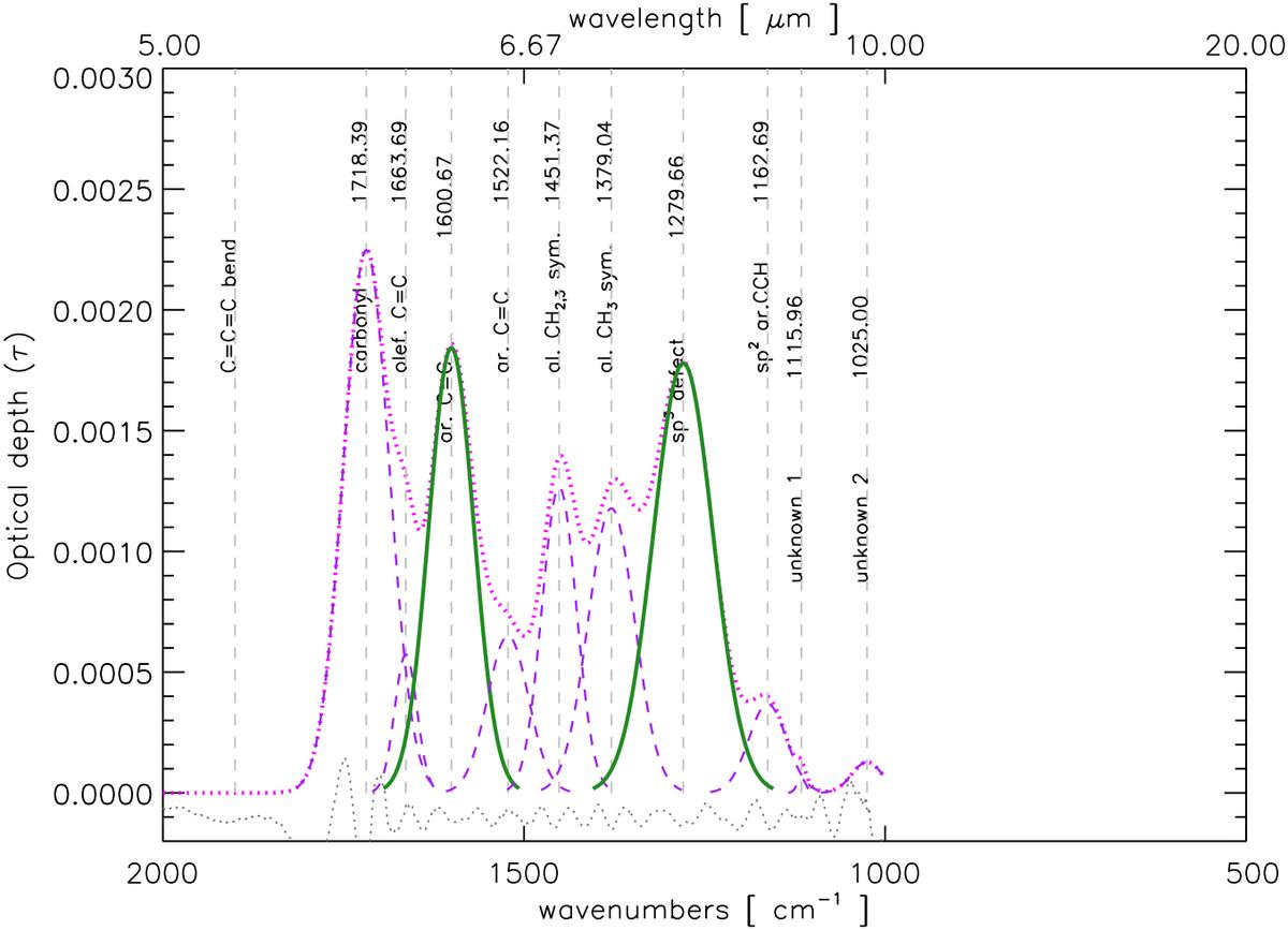 UV-VUV and mid-infrared spectral deconvolution for soot samples prepared with a C/O = 1 combustion flame, retrieved at a HAB of a) 18 mm to o) 39 mm.