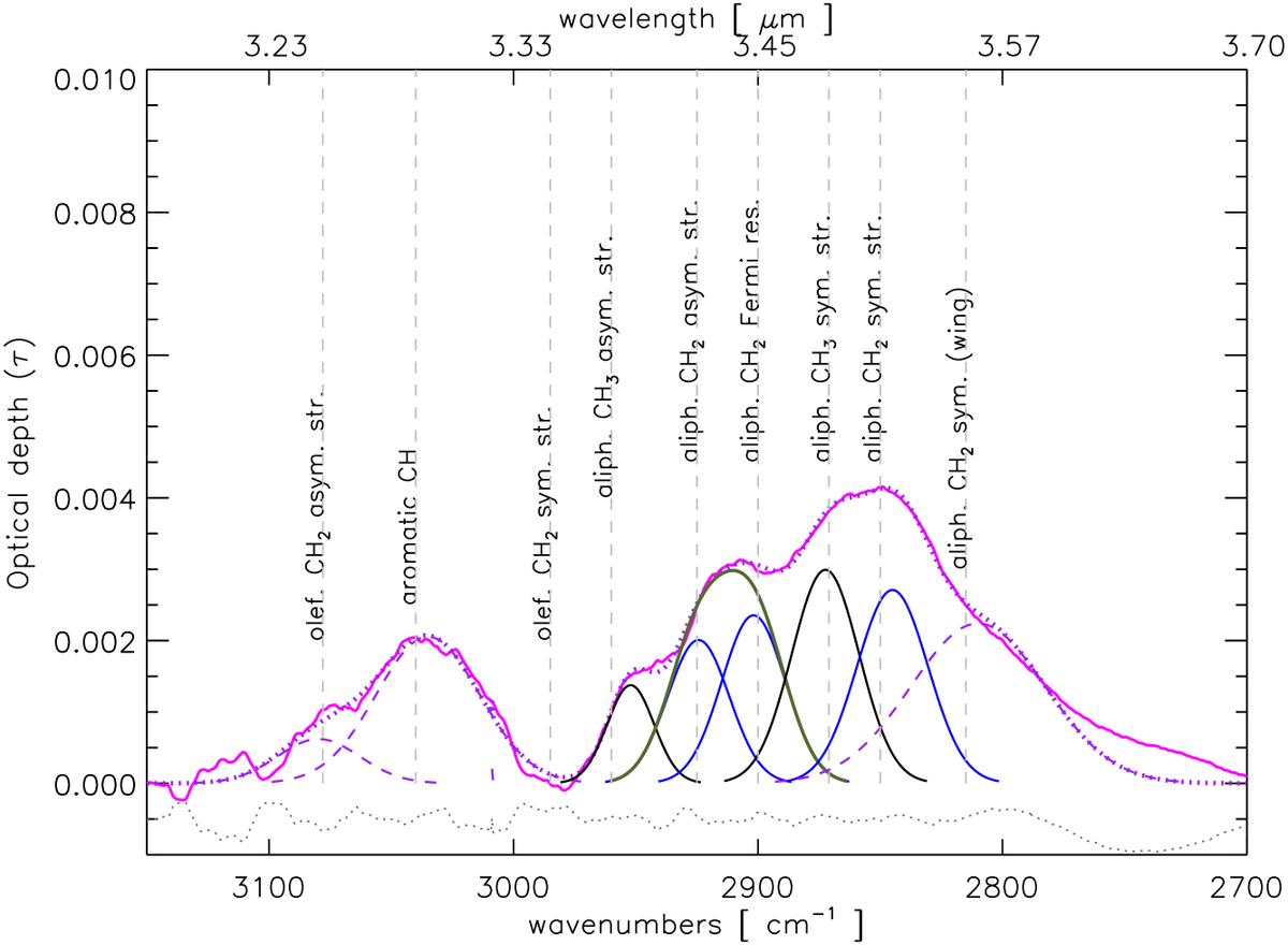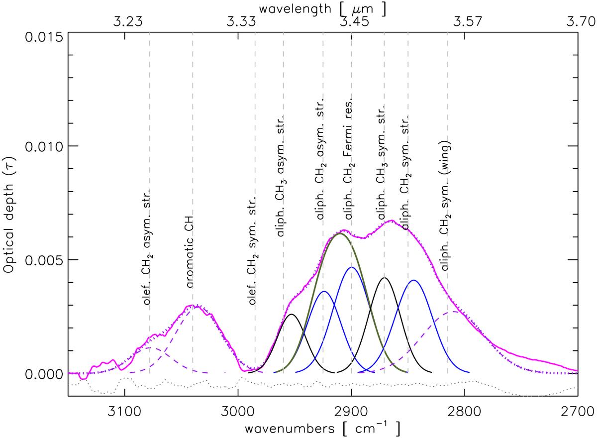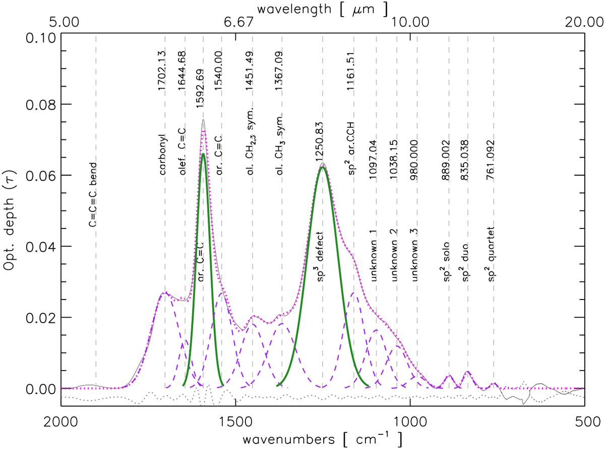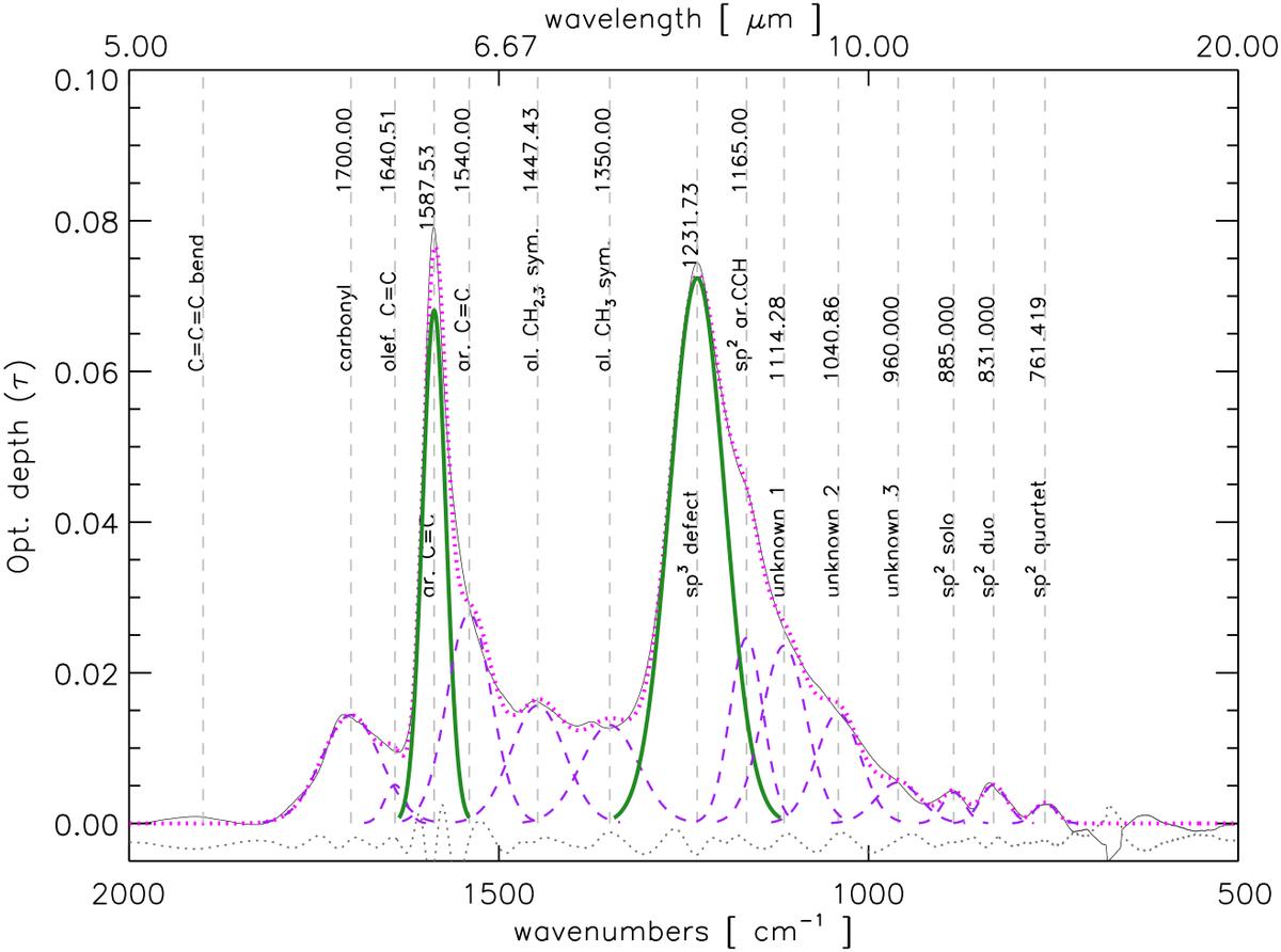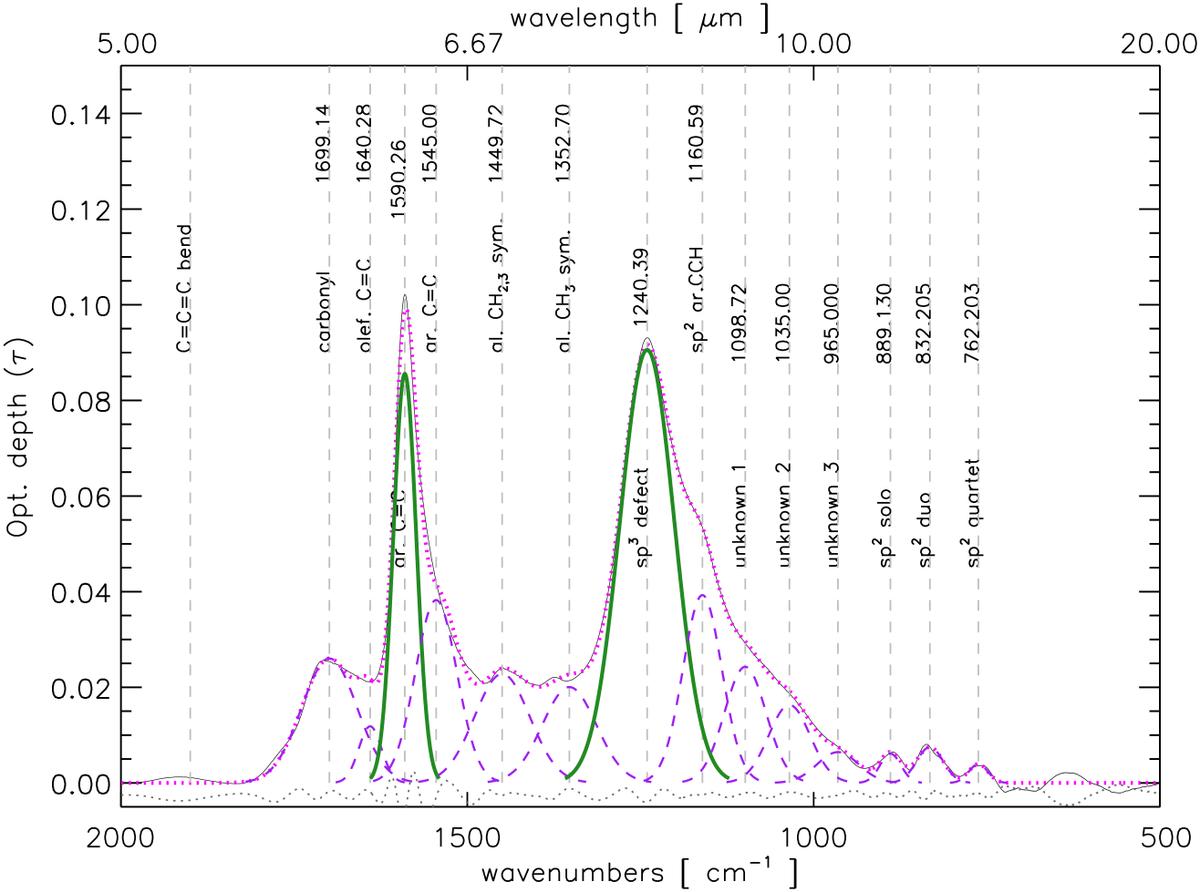 UV-VUV and mid-infrared spectral deconvolution for soot samples prepared with a C/O = 1.05 combustion flame, retrieved at a HAB of a) 22 mm to o) 30 mm.