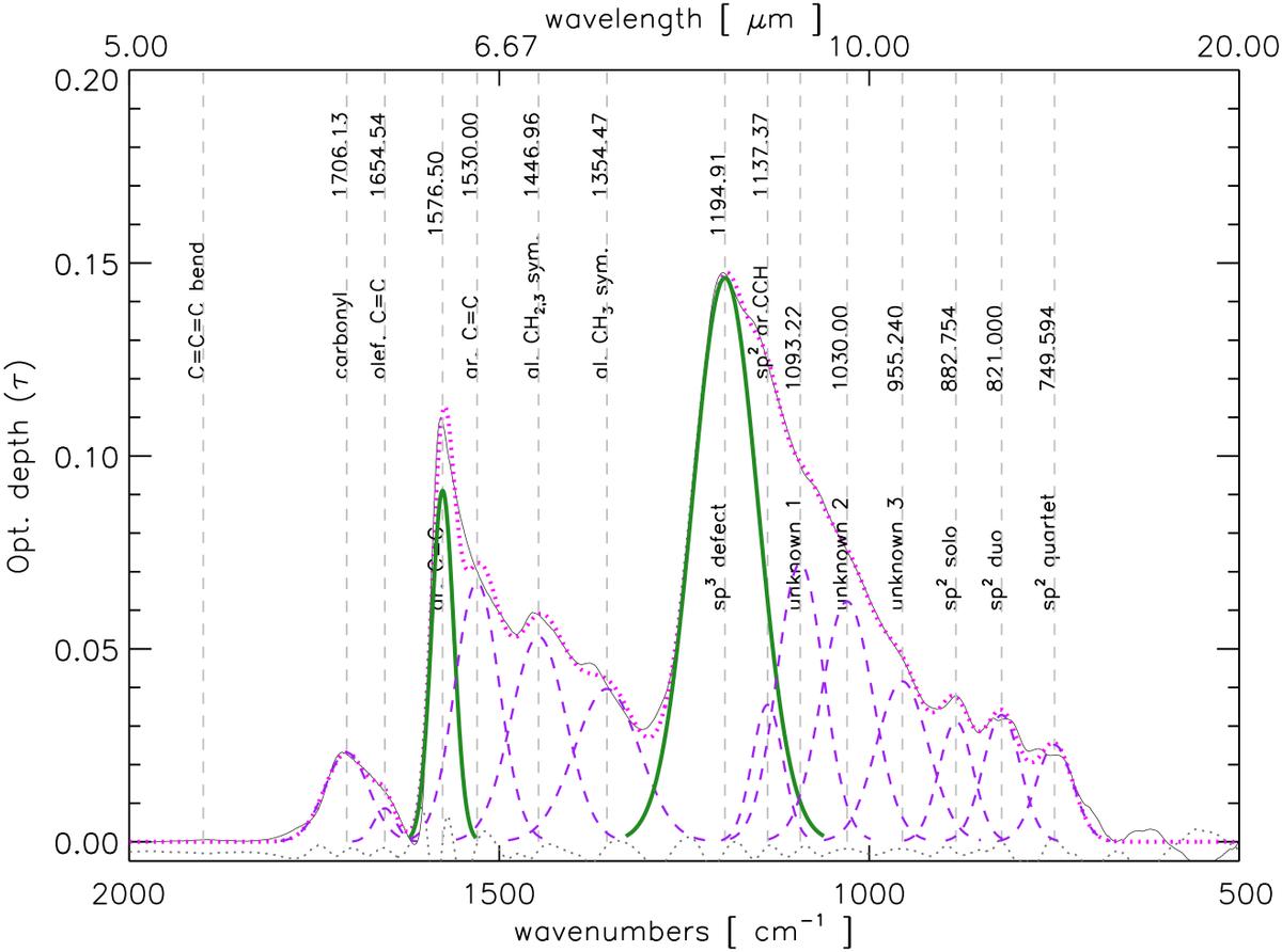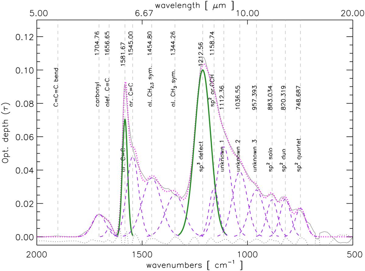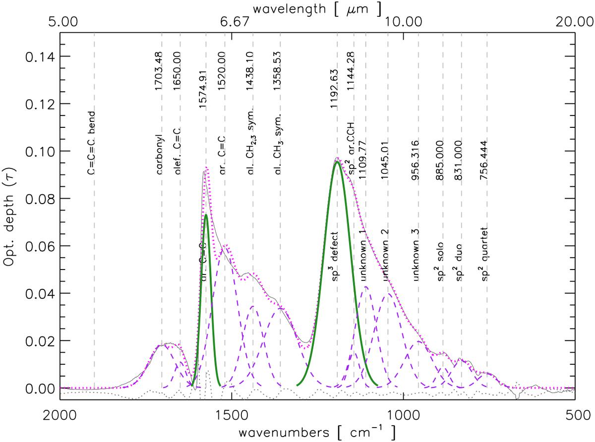 UV-VUV and mid-infrared spectral deconvolution for soot samples prepared with a C/O = 1.05 combustion flame, retrieved at a HAB of a) 32 mm to o) 50 mm.