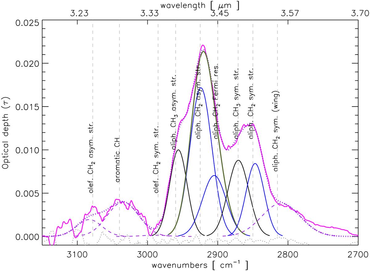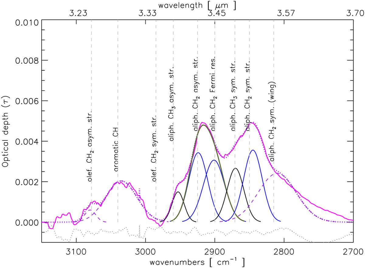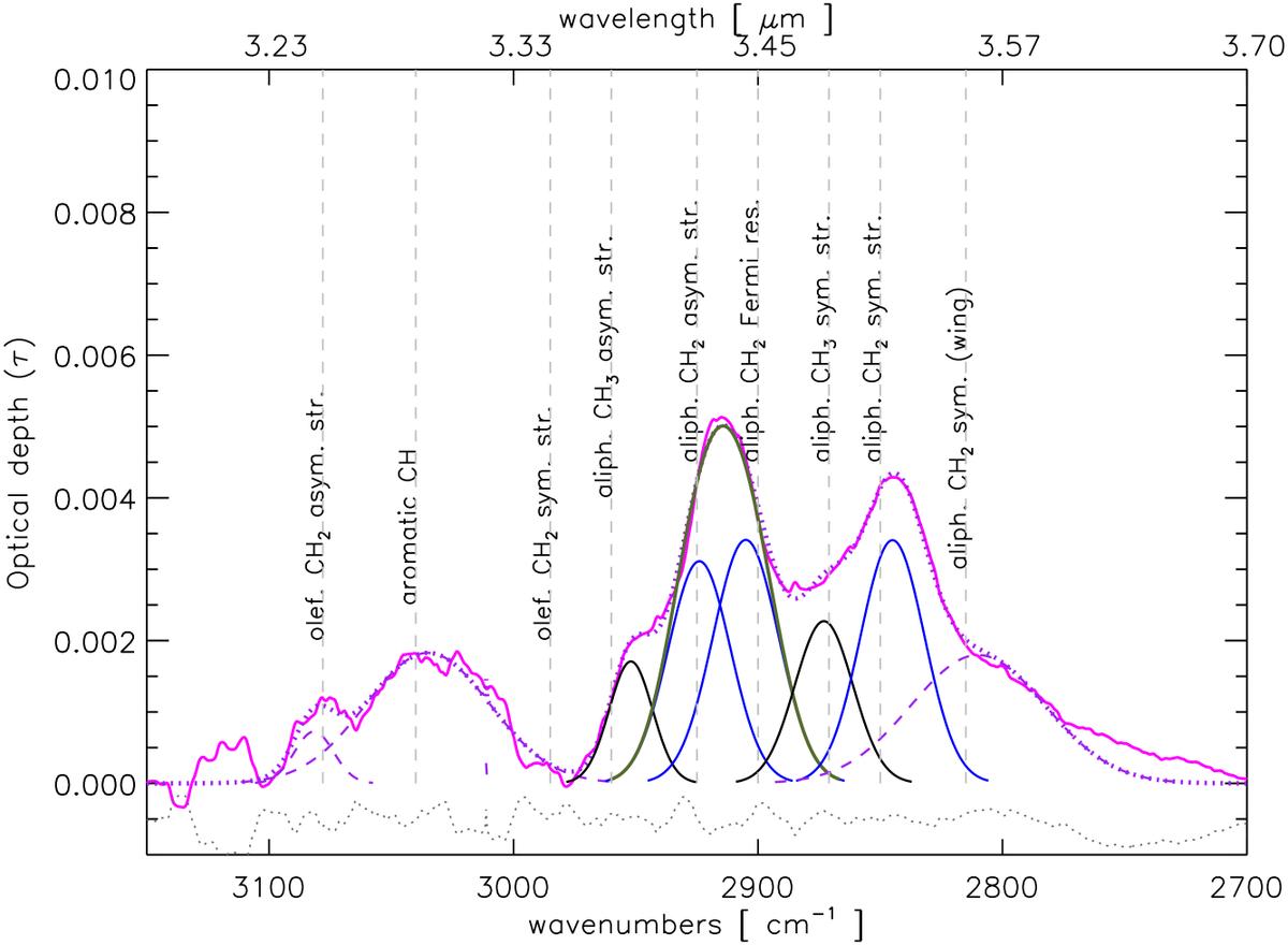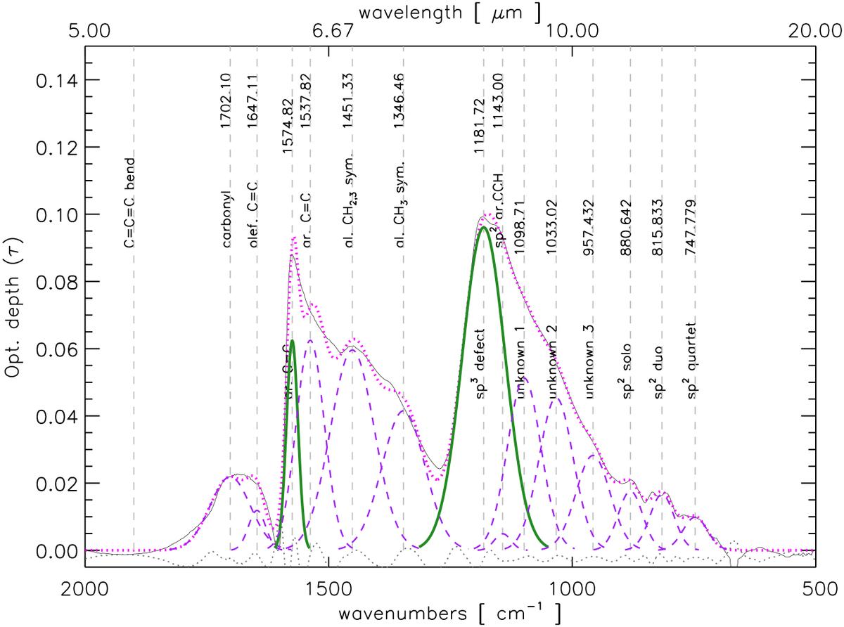 UV-VUV and mid-infrared spectral deconvolution for soot samples prepared with a C/O = 1.05 combustion flame, retrieved at a HAB of a) 32 mm to o) 50 mm.