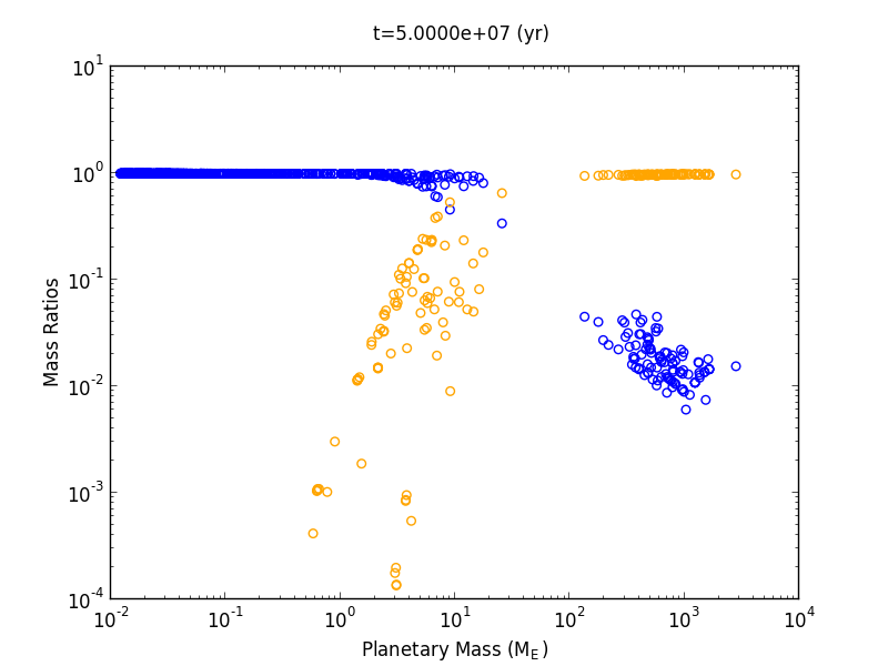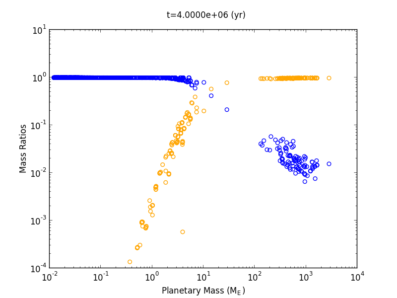 Core and envelope mass fractions for different planetary masses immediately before the disc dissipation (at 4 Myr, left panel), and at the end of the simulations (at 50 Myr, right panel). Orange and blue circles represent mass fractions of cores Mcore/Mpl and envelopes Menv/Mpl, respectively. Mass ratios for the core and envelope change significantly for Es/SEs due to the planet-planet collisions after disc dissipation.