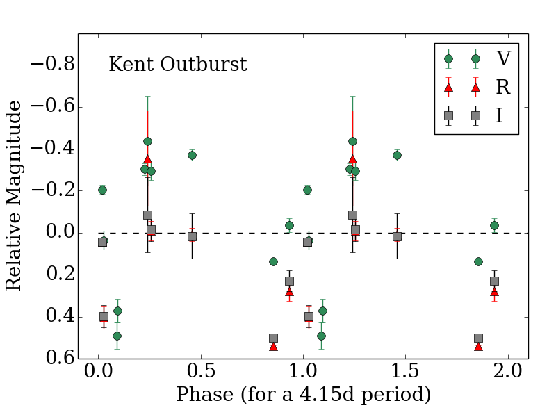 Top: phase-folded light curve for the data from the Beacon Observatory, using the 4.15 d period. Middle: phase-folded light curve for the LCOGT data during outburst. Bottom: phase-folded light curve for the LCOGT data during the post-outburst. All datasets are repeated to show two complete phases, and scaled to the average magnitudes. We note the phase shift between the datasets, which could be due to evolution of the spots. The color change in the post-outburst phase may show a brief occultation event in the g′ band.
