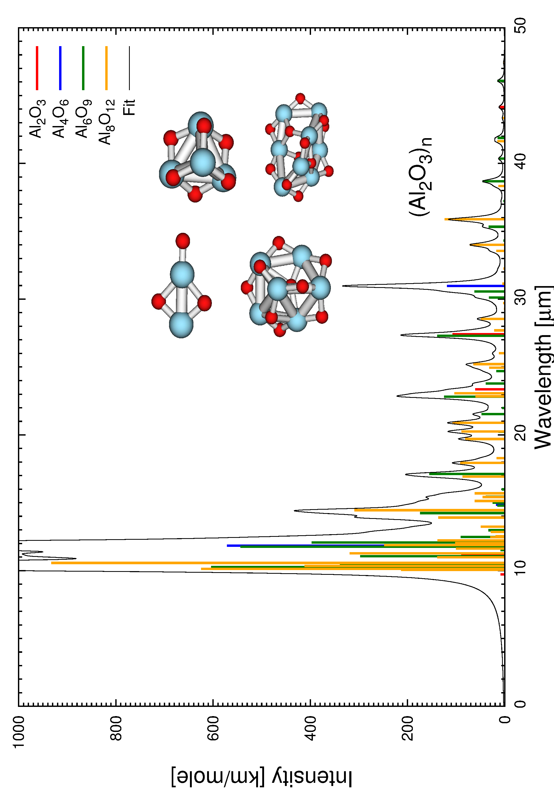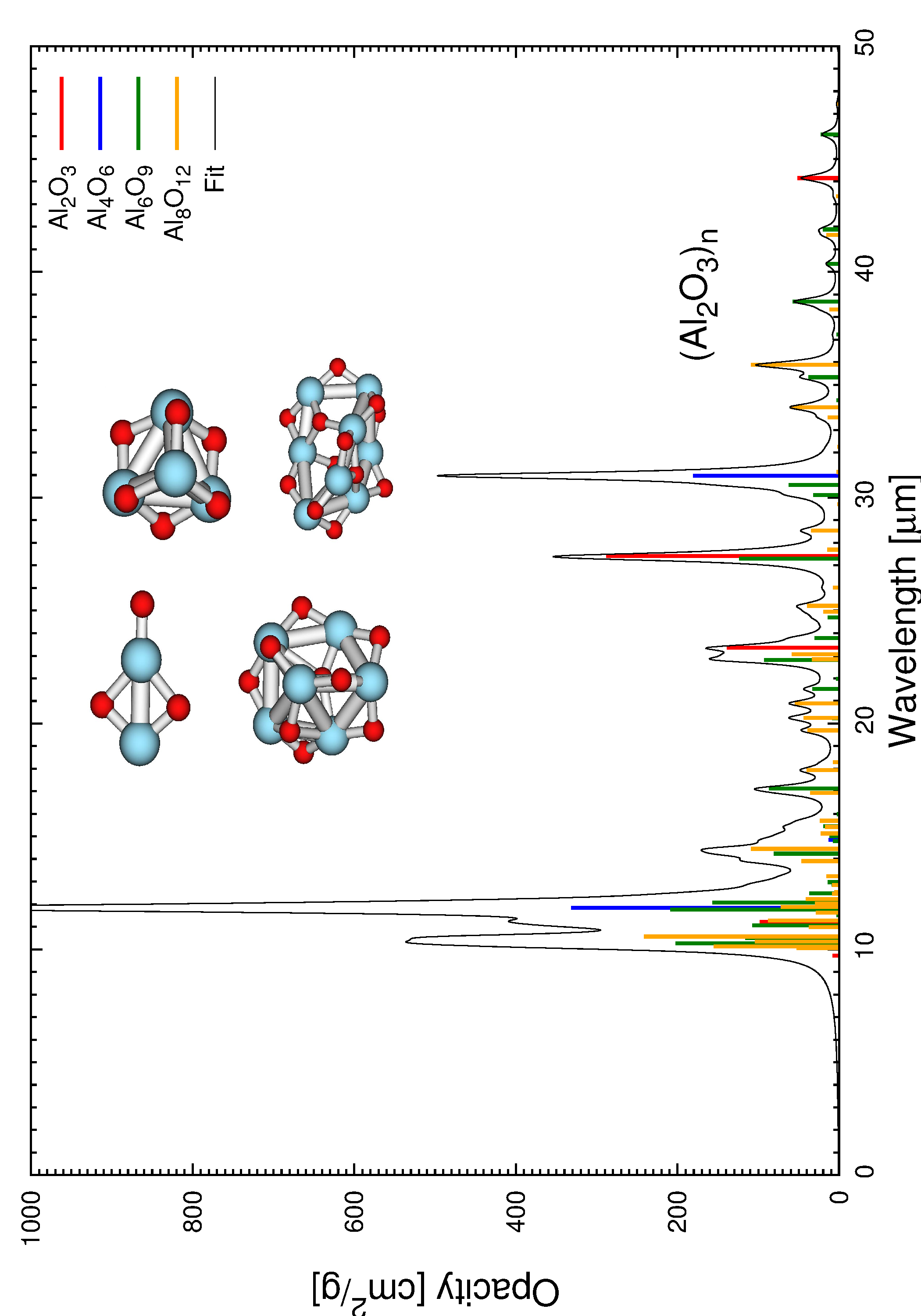 Vibrational spectrum of the (Al2O3)n, n = 1–4, ground-state clusters and their corresponding structures. The structures (for n = 1–4) are depicted with increasing n from left to right and from top to bottom. The black line represents a Lorentzian distribution with HWHM parameter γ = 0.2 for all peaks. The left panel shows the intensity in units of km/mole; the right panel the opacity in units of cm2/g.