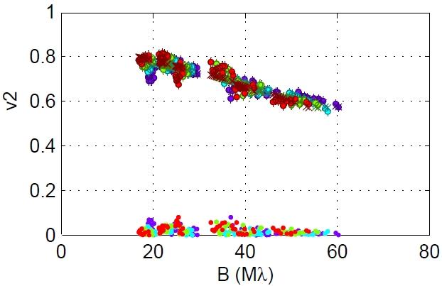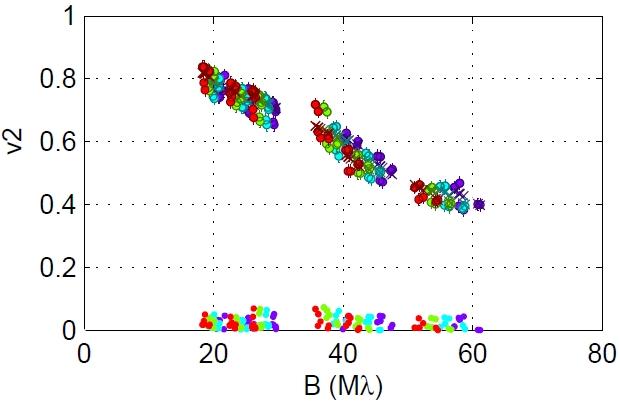 Squared visibility (V2) vs. projected baseline in units of 106λ for four FT spectral channels from our GRAVITY+UT observations of S CrA North (left panel) and South (right panel). The data and best fitting model are represented by filled symbols and crosses, respectively. The absolute value of the fit residuals is shown at the bottom of each panel. Different colours indicate different spectral channels.