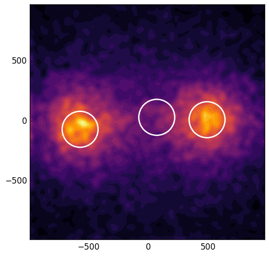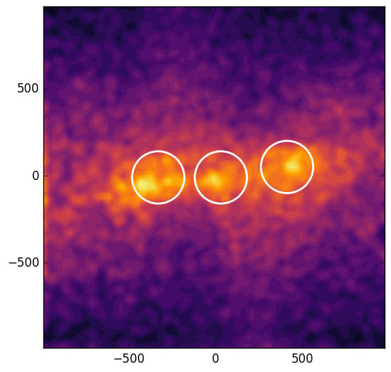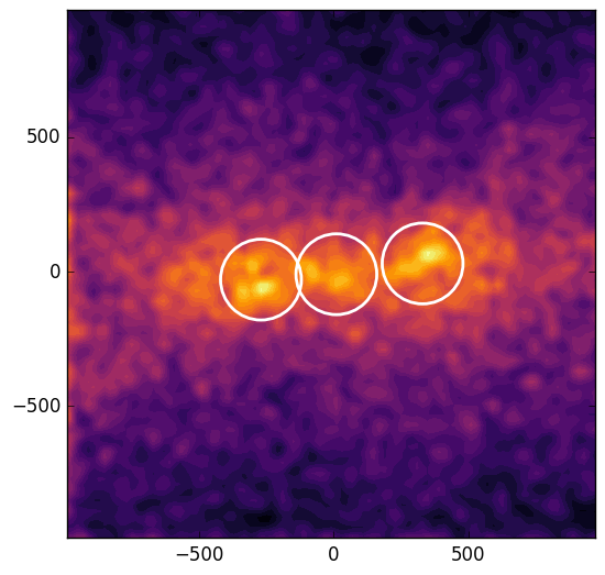 Results of the halo-finding algorithm for four different simulation runs. Top left: fDP = 10% and η = 1.0. In this case there is no central subhalo. Top right: fDP = 25% and η = 1.0. The algorithm found a small subhalo resulting from the Mach cones of the interacting dark plasma component. Bottom left: fDP = 40% and η = 1.0. In this case, there is a clear central subhalo. Bottom right: fDP = 40% and η = 10.0. In this case a central subhalo is present, and the distance of the outer subhalos is reduced. The scale of all pictures is given in kpc, and the contours represents the projected mass density.