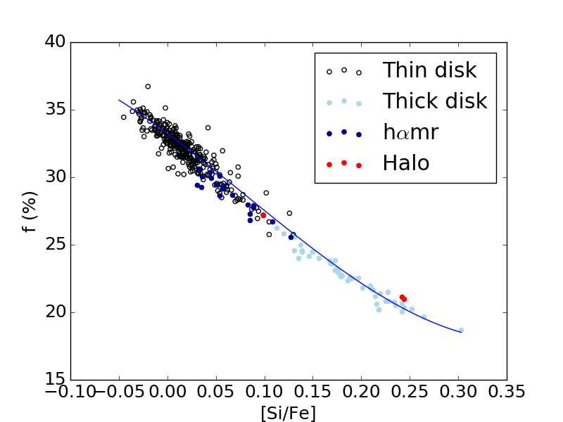 Upper panel: values of firon as a function of [Si/Fe]. Middle and lower panels: Z as a function of two different index values as defined in the text. Different galactic populations are denoted with different symbols. The lines denote linear cubic fits to the data.