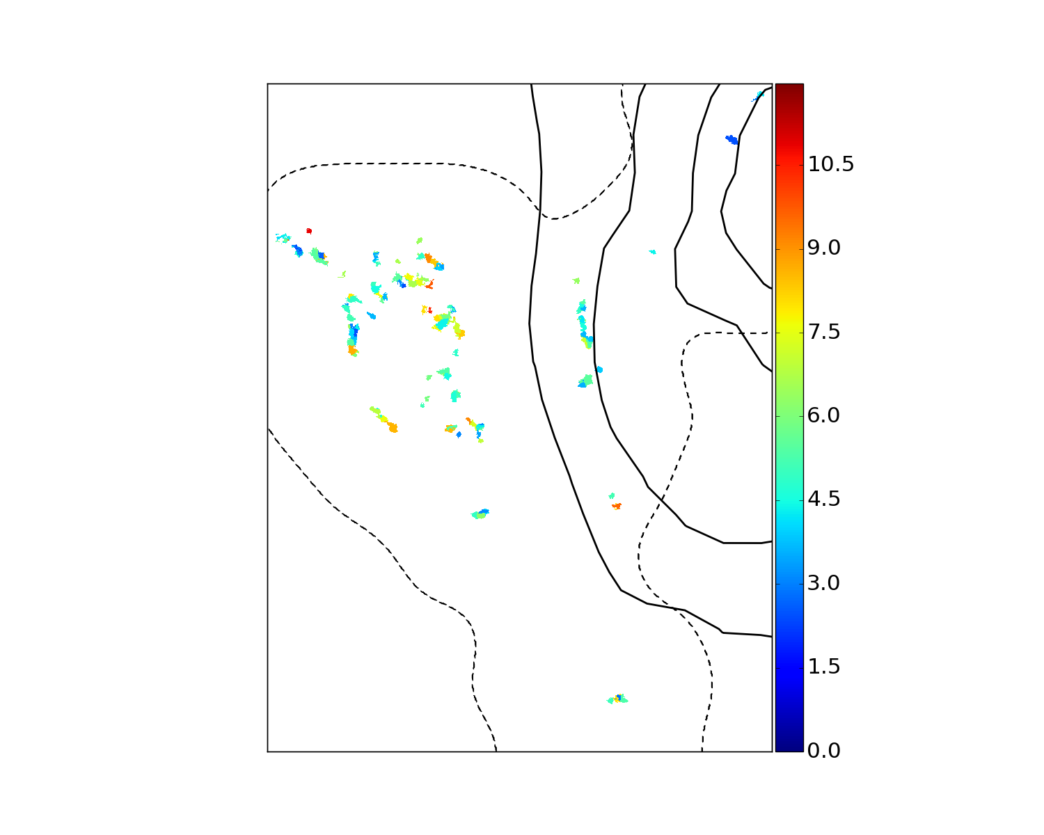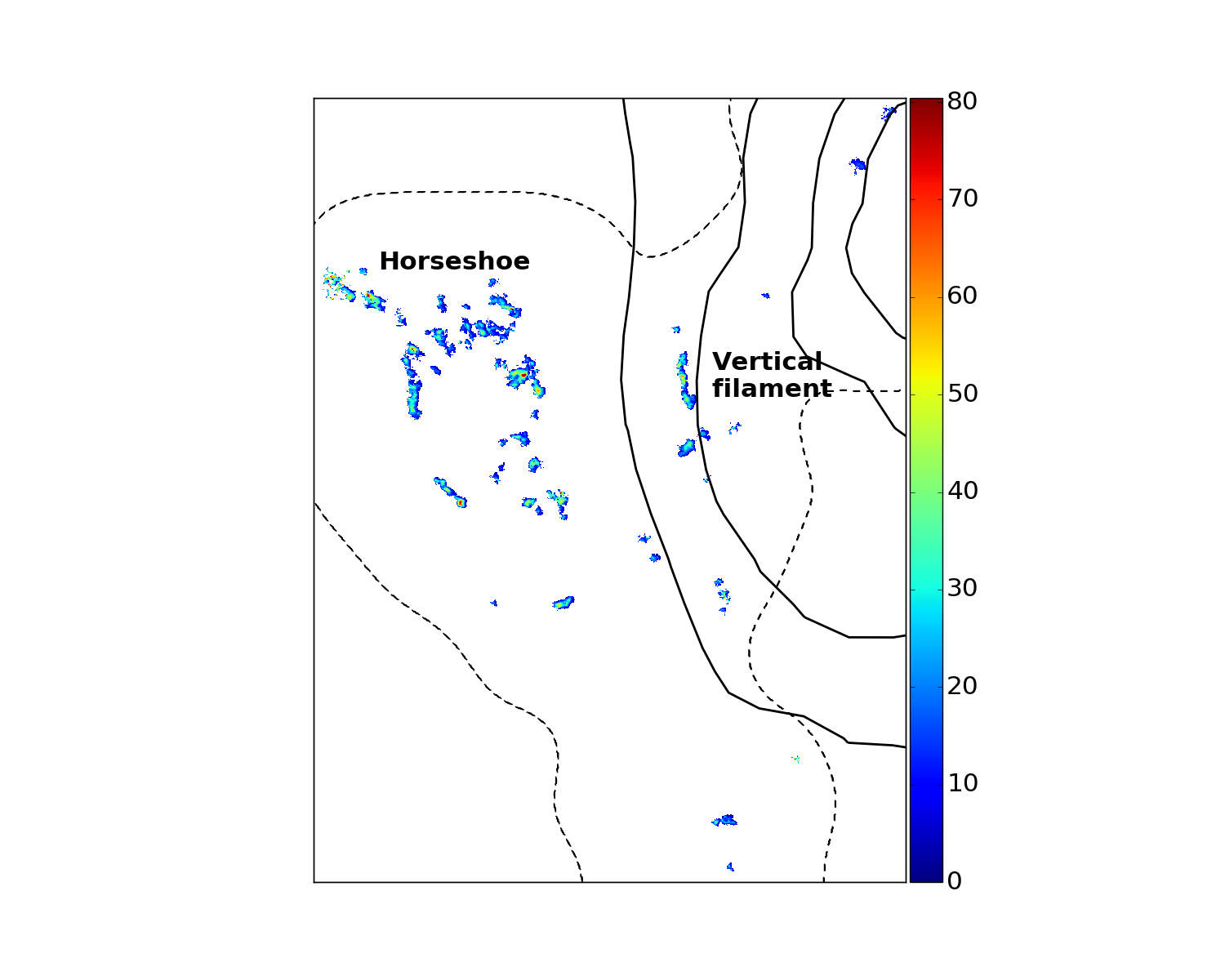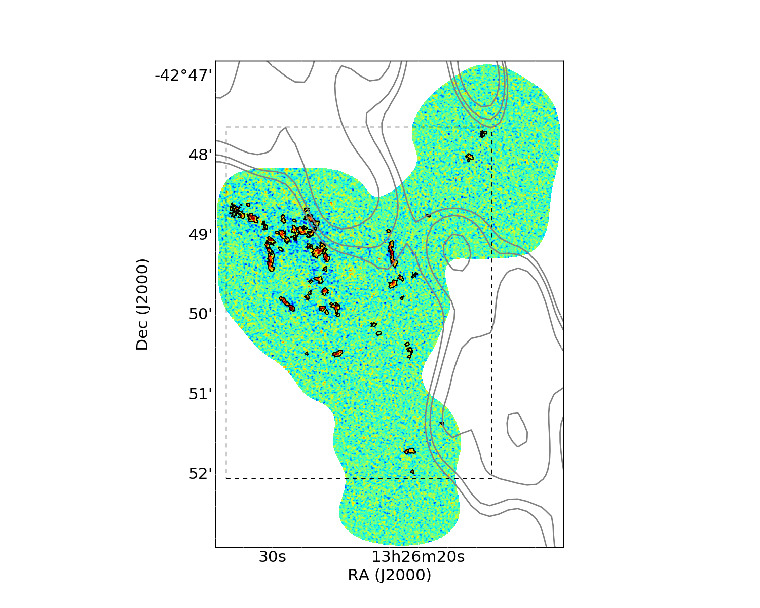 Top left: map of the moment 0 of the ALMA data produced with CASA. We reported, in black contours, the structures extracted by the method presented in Sect. 2.2. We indicate the location of the radio jet in grey contours. Top right: integrated CO intensity map in mJy km s-1 of the molecular clouds seen in CO(1–0) with ALMA. Bottom: maps of the central velocity relative to Centaurus A (left) and velocity dispersion (right) in km s-1 of the clouds. The area of the three maps corresponds to the dashed box in the moment 0 map. The full line and dashed contours represent the HI emission (Schiminovich et al. 1994) and the region observed with ALMA, respectively. The CO emission is clumpy and covers only a small fraction of the region mapped with ALMA.