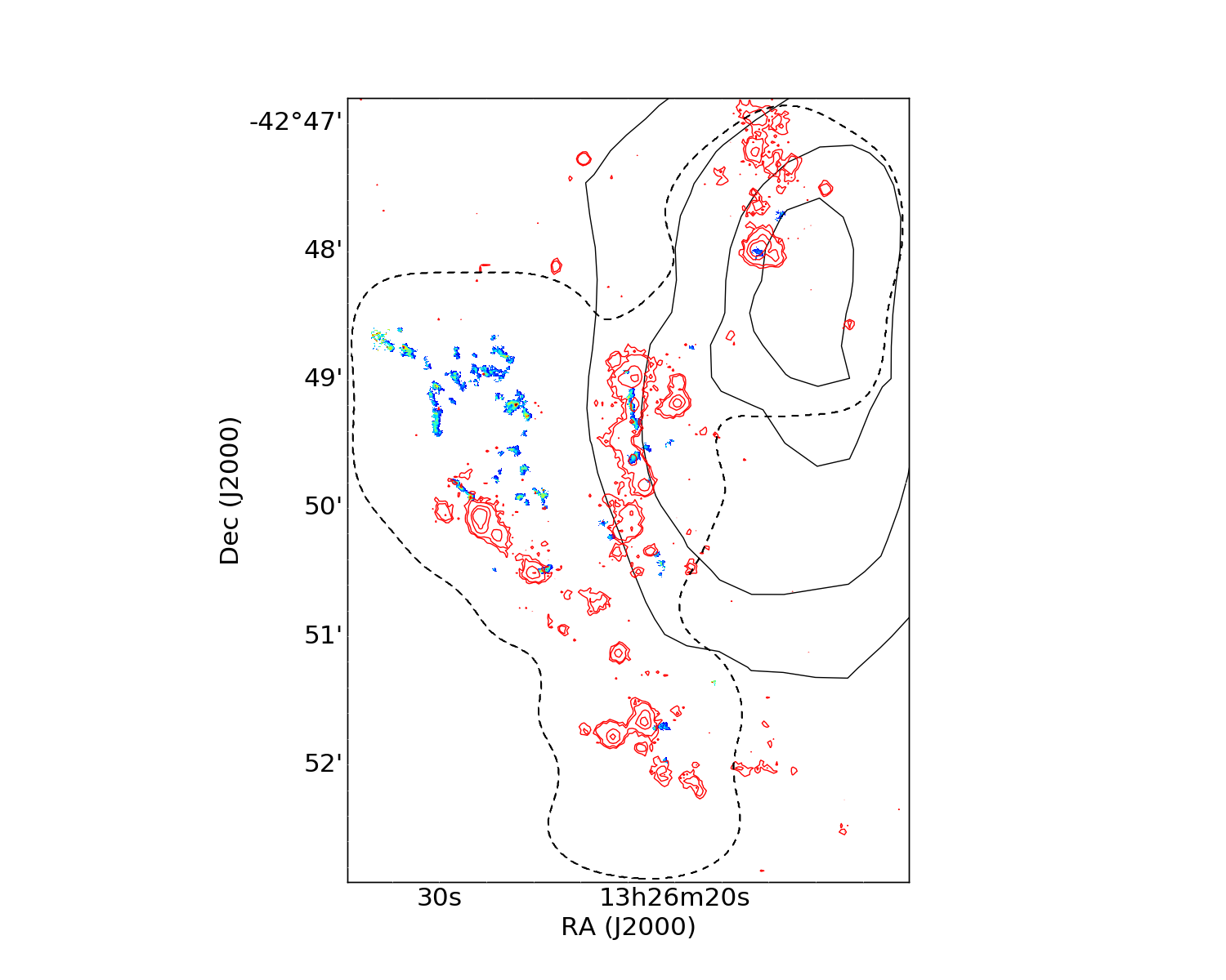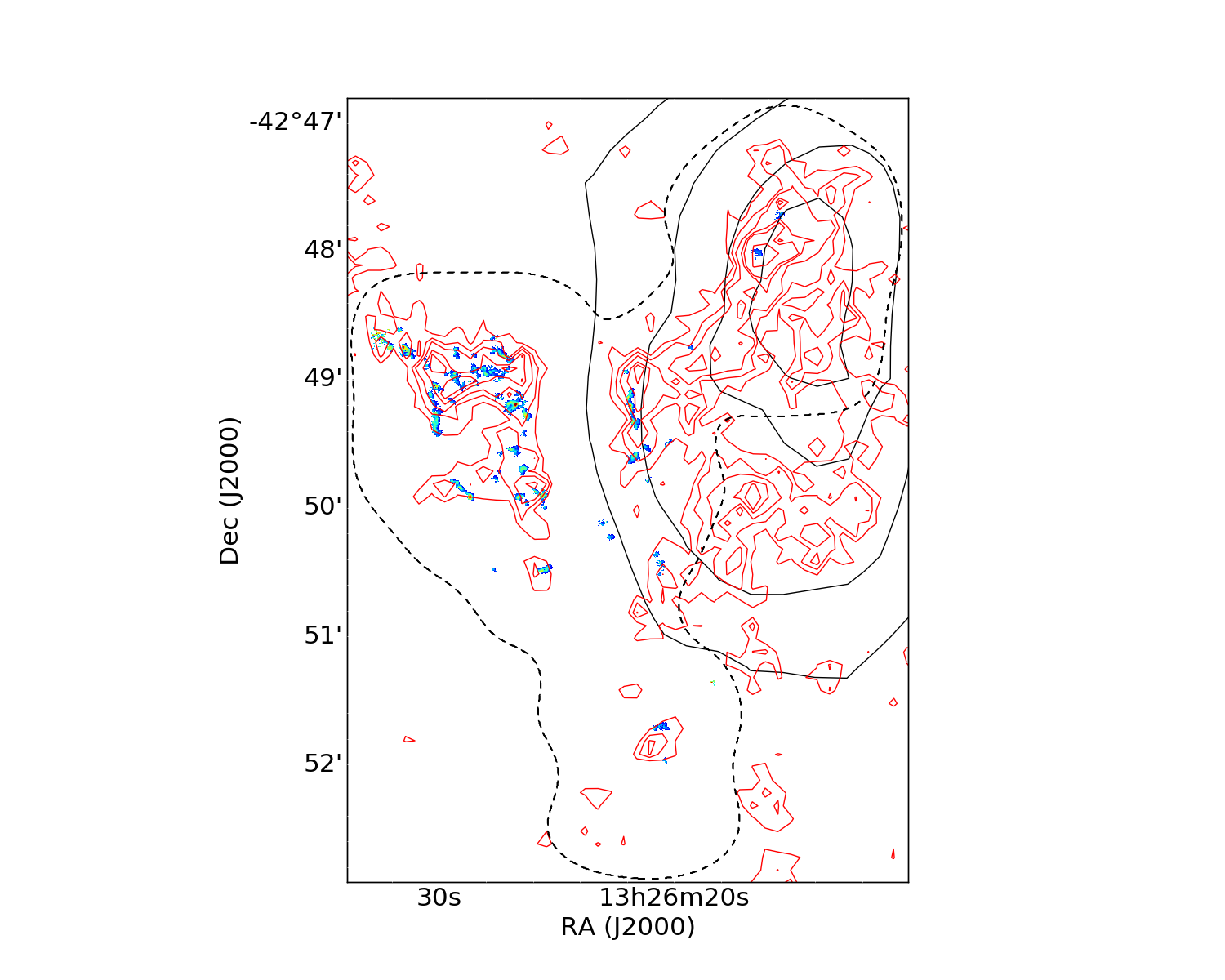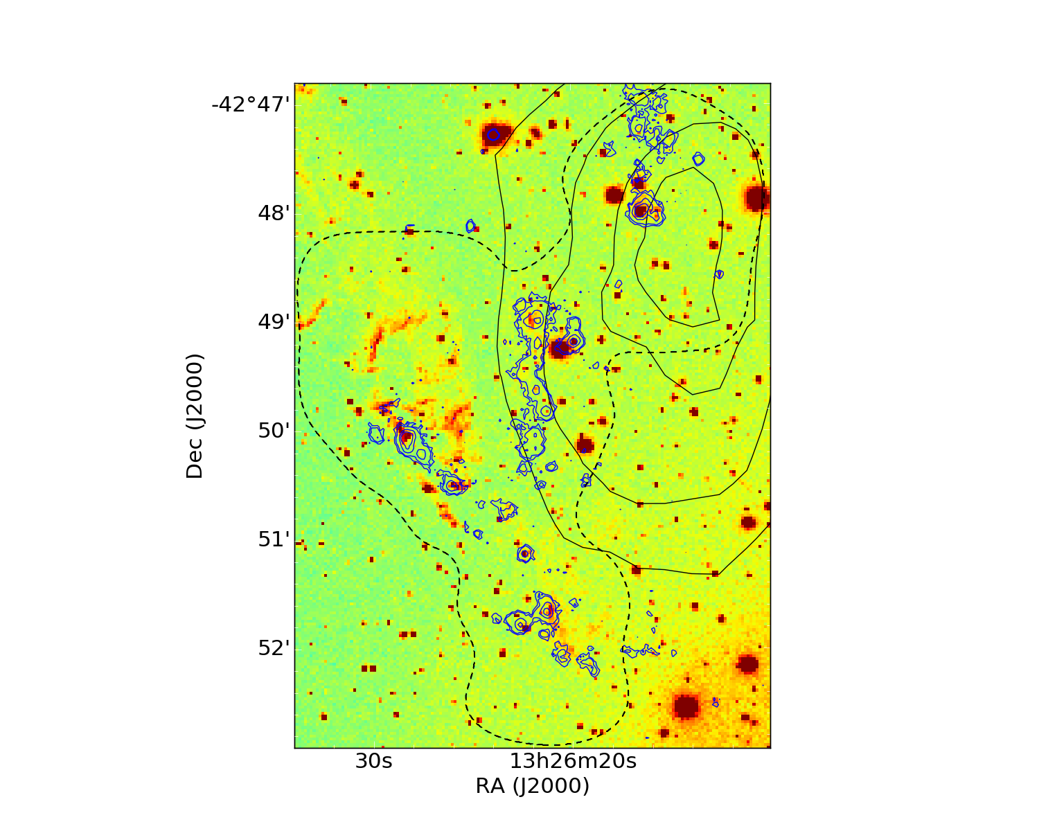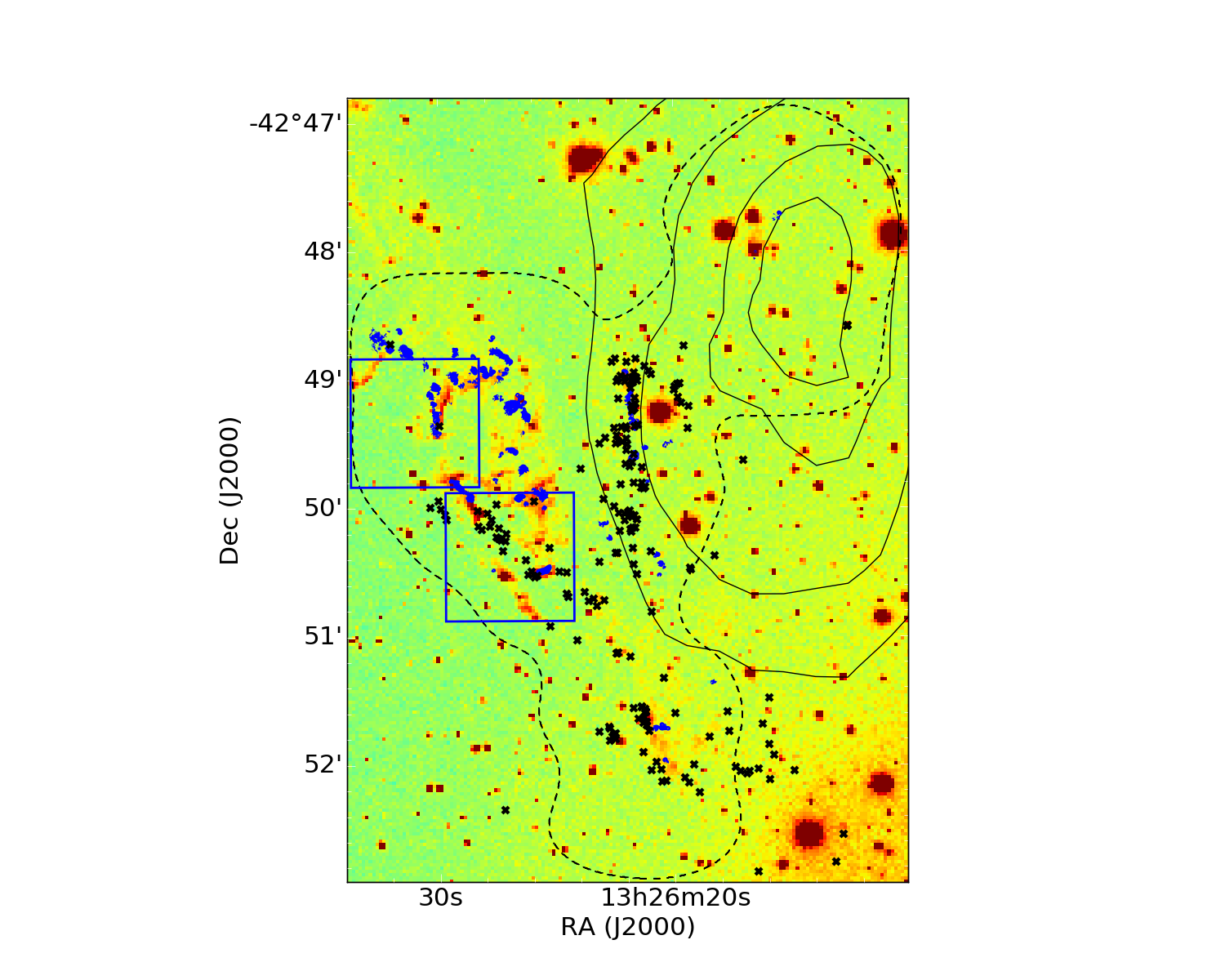 Distribution of the ALMA CO(1–0) emission in relation to star formation regions. Top: CO intensity map with contours of the GALEX FUV (left – Neff et al. 2015a) and Herschel FIR (right) emission. Bottom: the colour map represents the Hα emission seen with CTIO. In all four images, the black contours represent the HI emission and the black dashed line corresponds to the area observed with ALMA. The crosses on the bottom right image indicate the position of the young star clusters from Rejkuba et al. (2001). The Horseshoe complex, which corresponds to the bright CO emission from Salomé et al. (2016a), is not associated with young stellar clusters. In contrast, the Vertical filament (at the edge of the HI shell) is associated with Hα, FUV emission, and young stellar clusters (Rejkuba et al. 2001), and is likely forming stars. It is not established whether the northern FUV emission is associated with young stars as it was not included in Rejkuba et al. (2001).