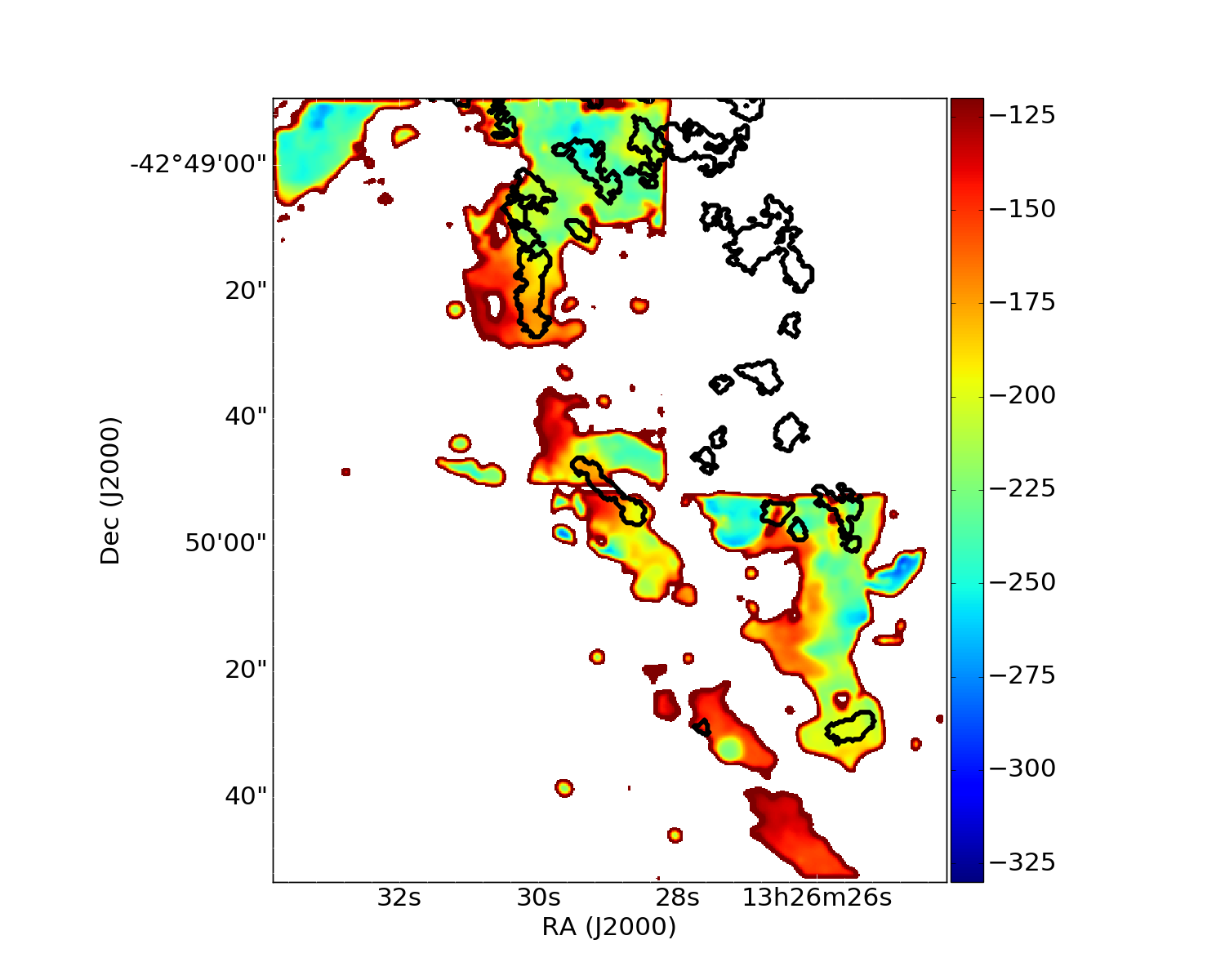Velocity maps in km s-1 of the Hα (left) and CO emission (right). The black contours in the left panel represent the ALMA CO(1–0) emission distribution. The colour scale is the same for both maps, with a velocity range −330 <v< −120km s-1, relative to Centaurus A. It is thus clear that the CO is blueshifted compared to the Hα emission.