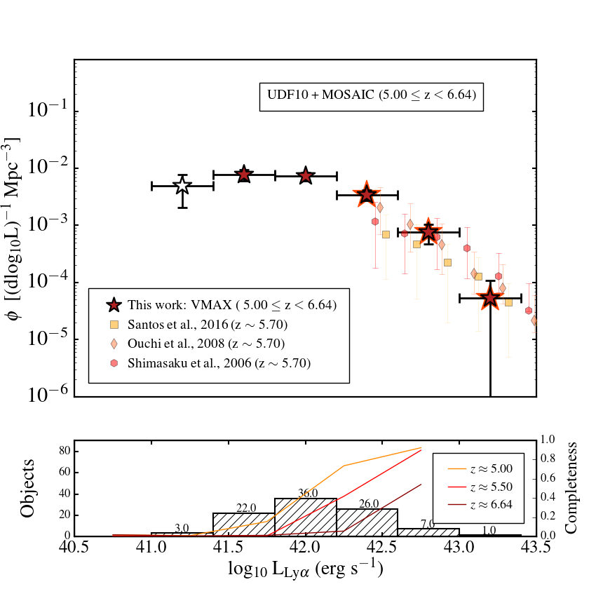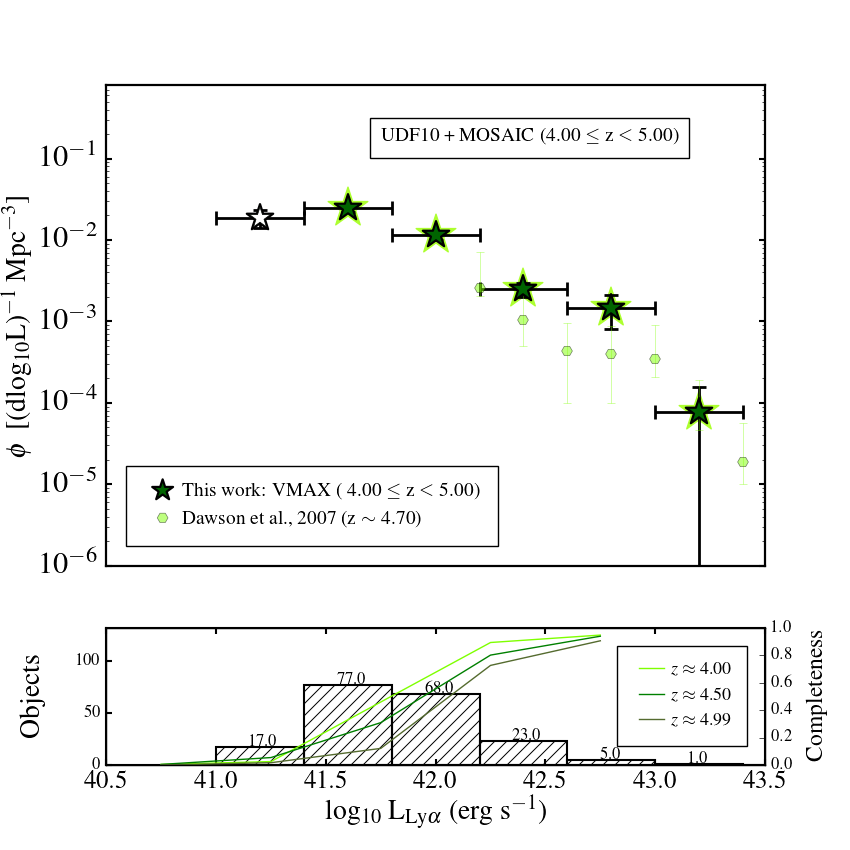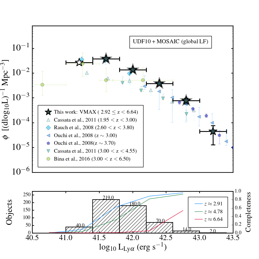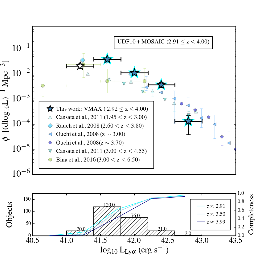 Number densities resulting from the 1 /Vmax estimator. Top left: 2.91 ≤ z< 4.00 bin, blue; top right: 4.00 ≤ z< 5.00 bin, green; bottom left: 5.00 ≤ z< 6.64 bin, red; bottom right: all LAEs 2.91 ≤ z< 6.64. In each panel we show number densities in bins of 0.4 dex, together with literature results at similar redshifts from narrowband or long-slit surveys. In the lower part of each panel we show the histogram of objects in the redshift bin overlaid with the completeness estimate for extended emitters at the lower, middle and highest redshift in each bin. In each panel we flag incomplete bins with a transparent datapoint. Errorbars represent the 1σ Poissonian uncertainty, we note that often the ends of the bars are hidden behind the data point itself.