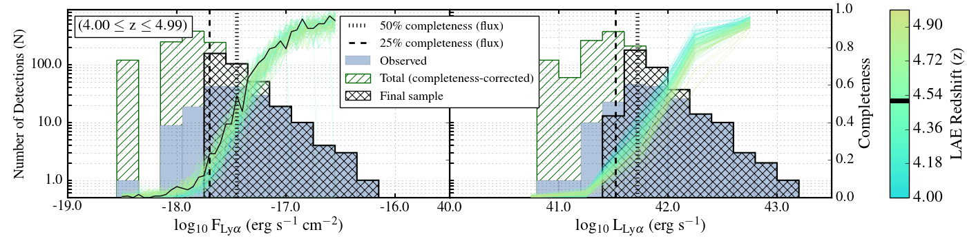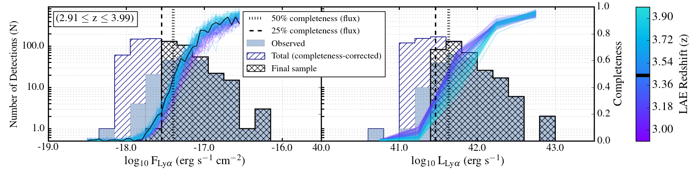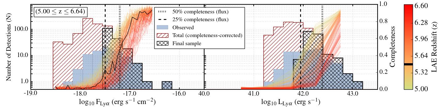 Flux and log-luminosity distributions of objects from the mosaic in three broad redshift bins at 2.91 ≤ z< 4.00, 4.00 ≤ z ≤ 4.99 and 5.00 ≤ z< 6.64. In each panel we show the total distribution of objects (including fakes created and added to the sample through the process described in Sect. 5.2) in a coloured hatched histogram. We overlay the distribution of observed objects in filled blue bars. The final samples, curtailed at the 25% completeness limit in flux (Δ f = 0.05) for the median redshift of objects in the redshift bin is overplotted in a bold cross-hatched black histogram. Overlaid on each panel are the completeness curves as a function of flux (or log luminosity) at each redshift (Δ z = 0.01) falling within the bin. Each redshift is given by a different coloured line according to the colour-map shown in the colour bar, and the curve at the median redshift of the bin is emphasized in black. The median redshift of the bin is also given by a black line on the colour bar.