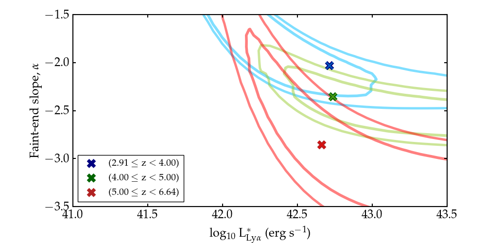 Maximum likelihood Schechter luminosity functions for three redshift bins 2.91 ≤ z < 4.00, blue; 4.00 ≤ z < 5.00, green; 5.00 ≤ z < 6.64, red. In the upper panel we show 68% and 95% joint confidence regions which correspond to ΔS=2.30 and 6.18 for two free fit parameters (L∗ and α). In the lower panel we show the maximum likelihood Schechter functions as solid lines.