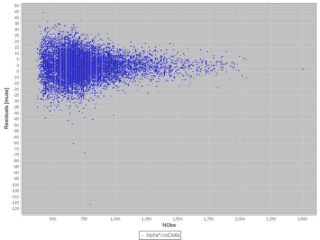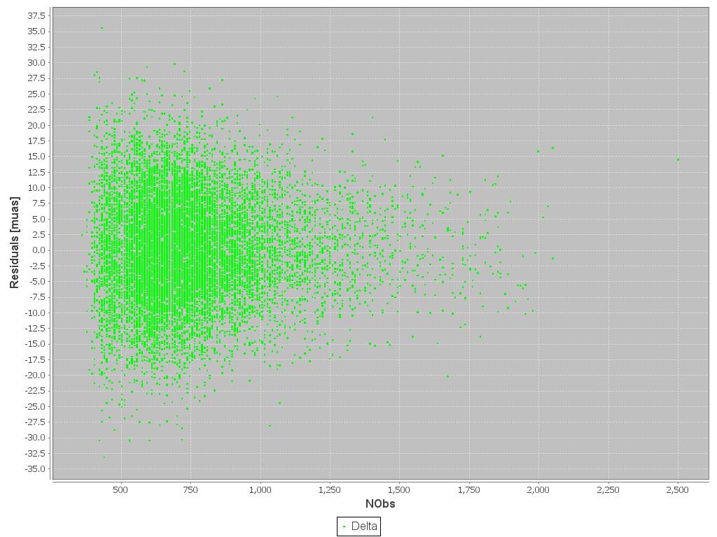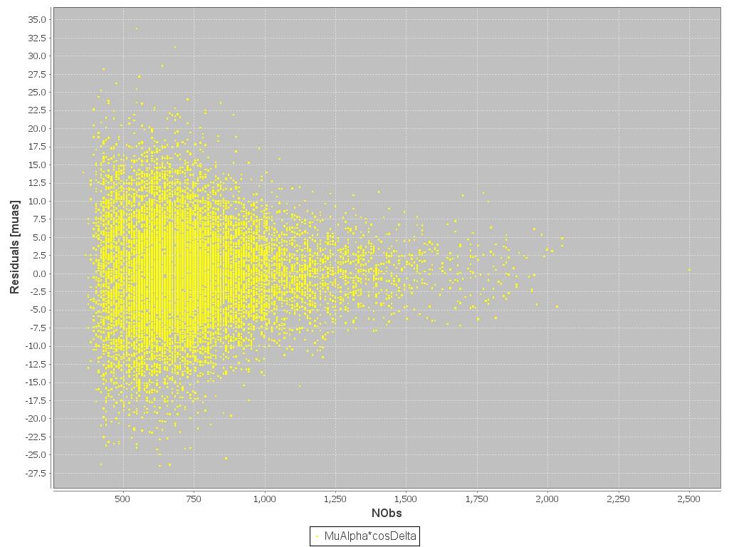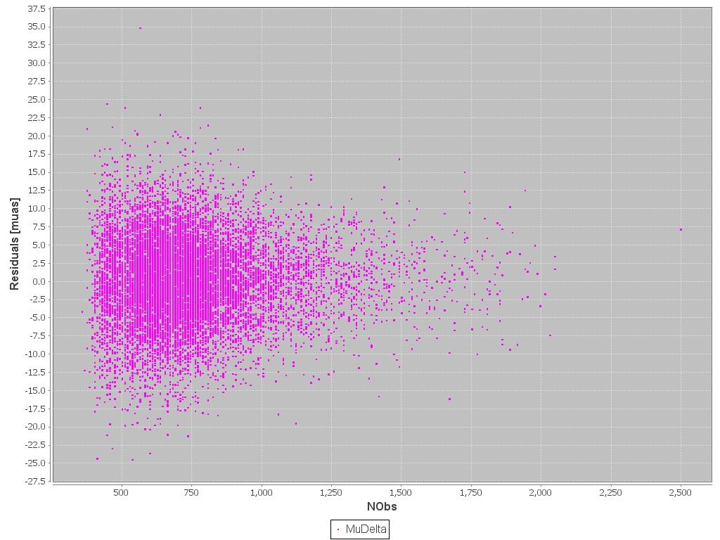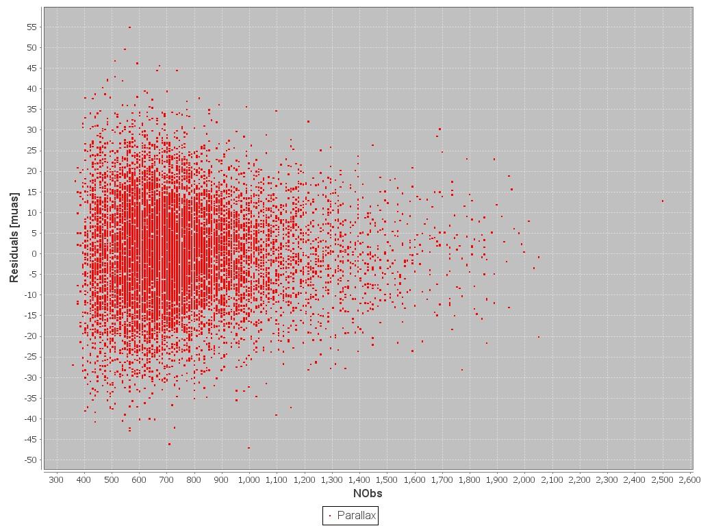 Astrometric post-fit residuals for a set of 132 000 stars as function of the number of observations for each star (red: ϖ, blue: αcosδ, green: δ, yellow: μαcosδ, purple: μδ) .