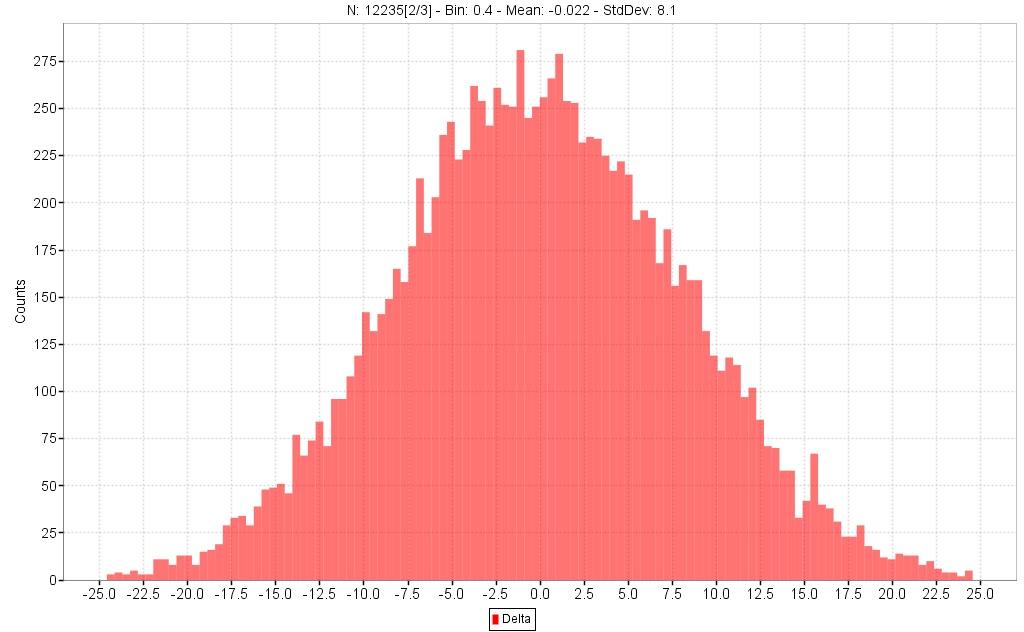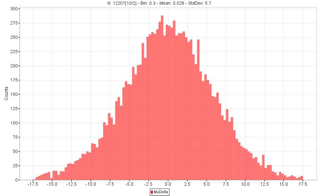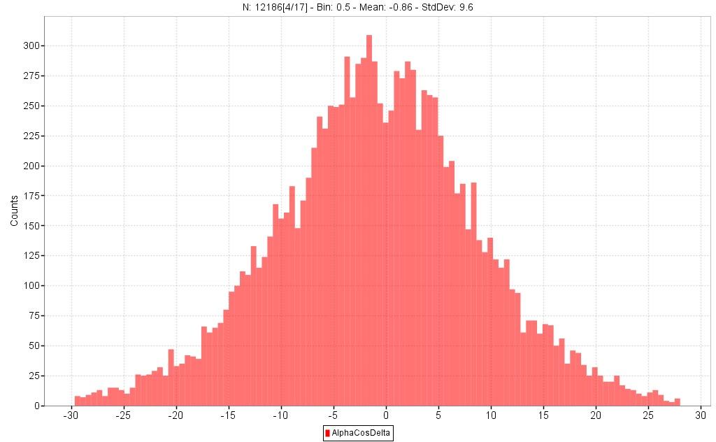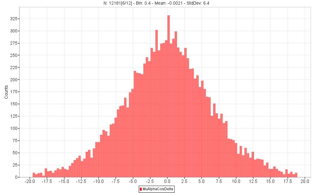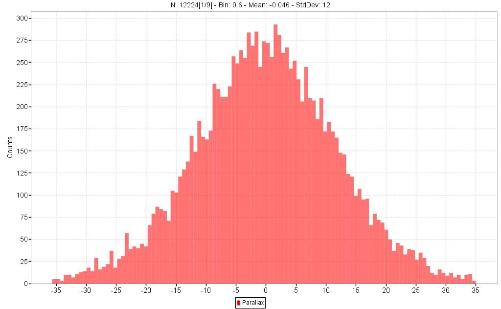 Histogram of post-fit residuals for the astrometric parameters affected by measurement and catalog errors (see 0301 Col. in Table 1).