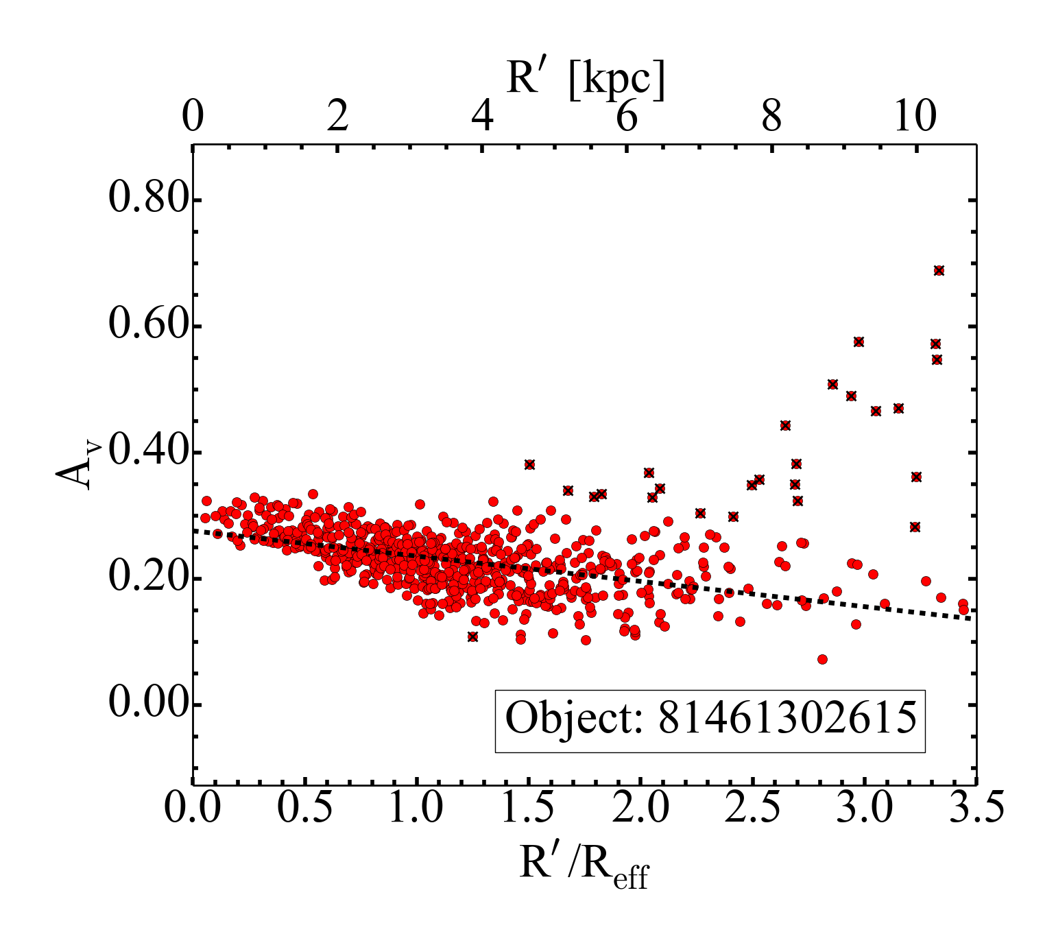 Luminosity-weighted stellar population properties maps and radial profiles analyzed using E-MILES-based models for the example object 81461302615. Left column: 2D maps for log Age, [Fe/H], and Av covering an area of 22′′ × 22′′ around the target galaxy. The color range has been chosen to highlight inhomogeneities. Right column: log Age, [Fe/H], and Av as a function of the circularized galactocentric distance R′ (see Sect. 5). Each red circle corresponds to a bin in the 2D map. The black dashed line corresponds to the error-weighted linear fitting. Black crosses correspond to outliers identified during the sigma-clipping process and were not considered during the fit.