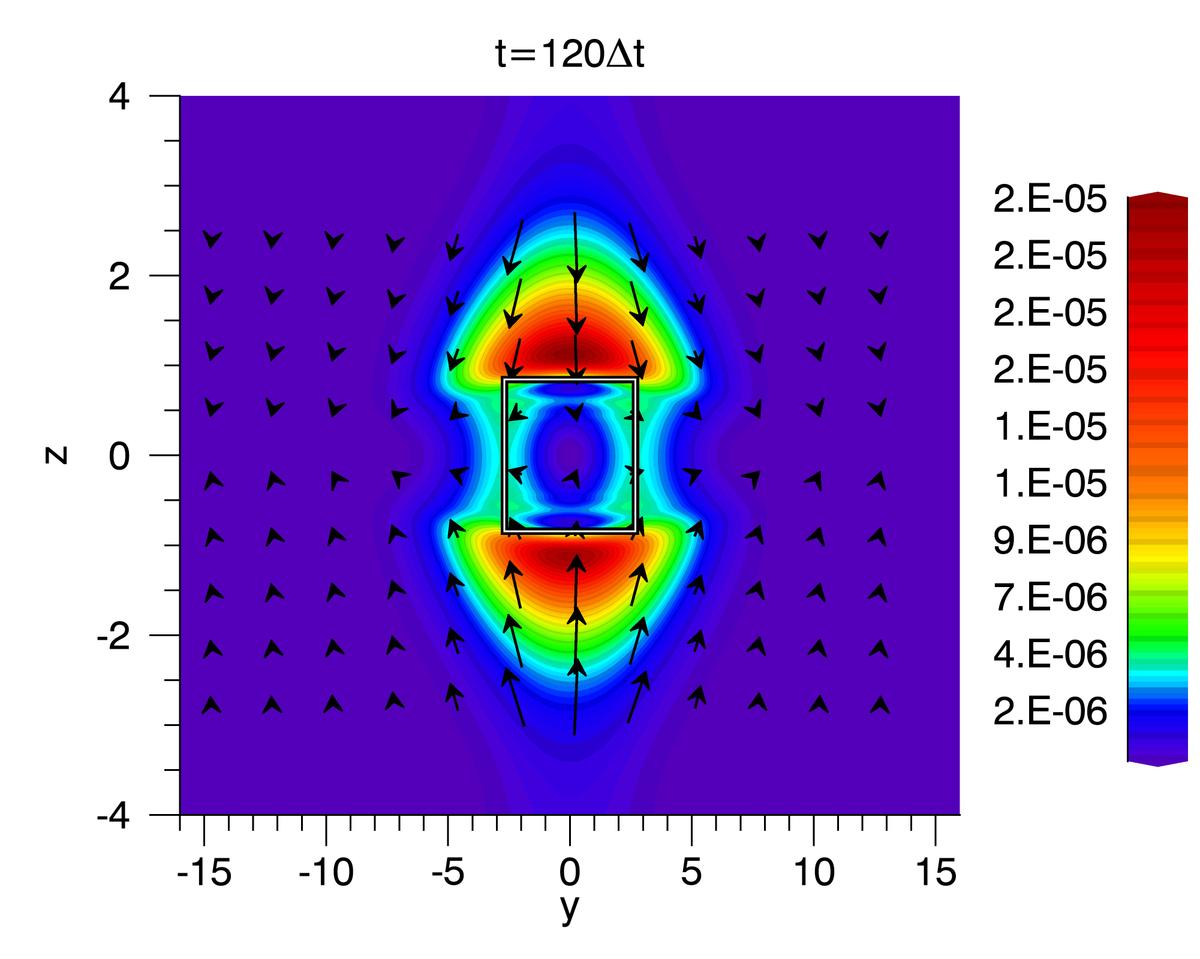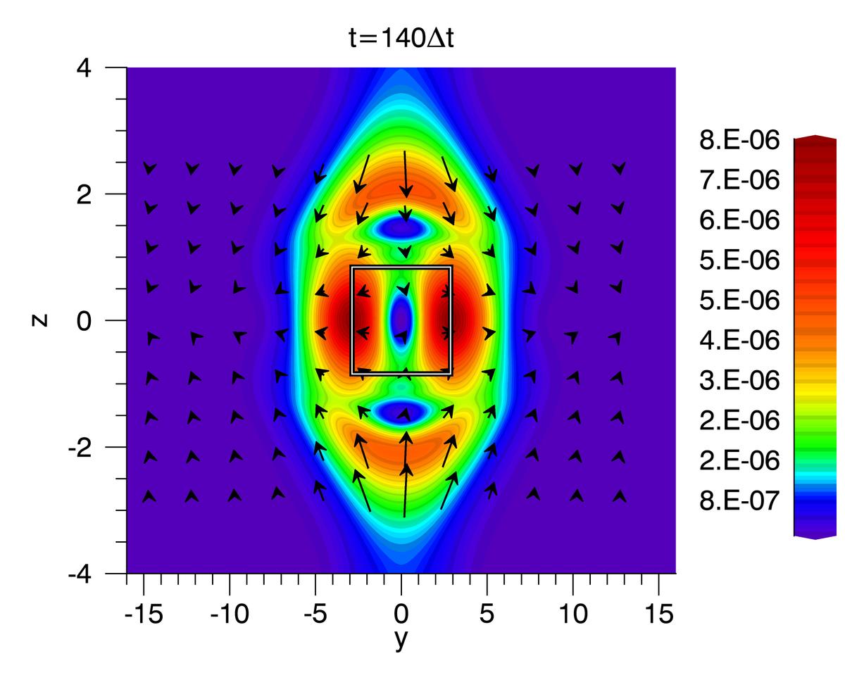 Fast-mode reflection shown in kinetic energy at times 80Δt, 120Δt and 140Δt for the coronal atmosphere. The white box frame denotes the reconnection region.