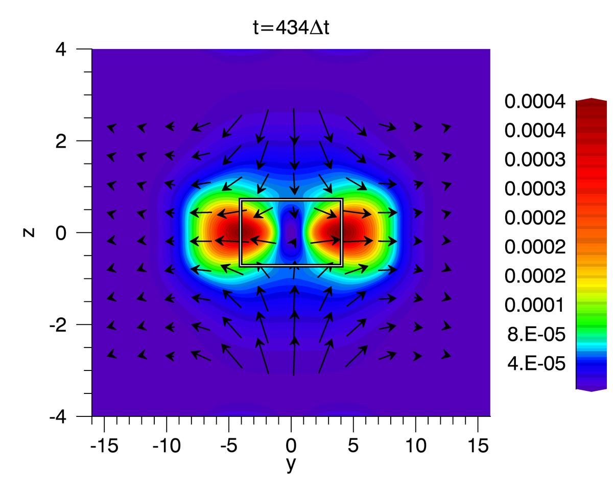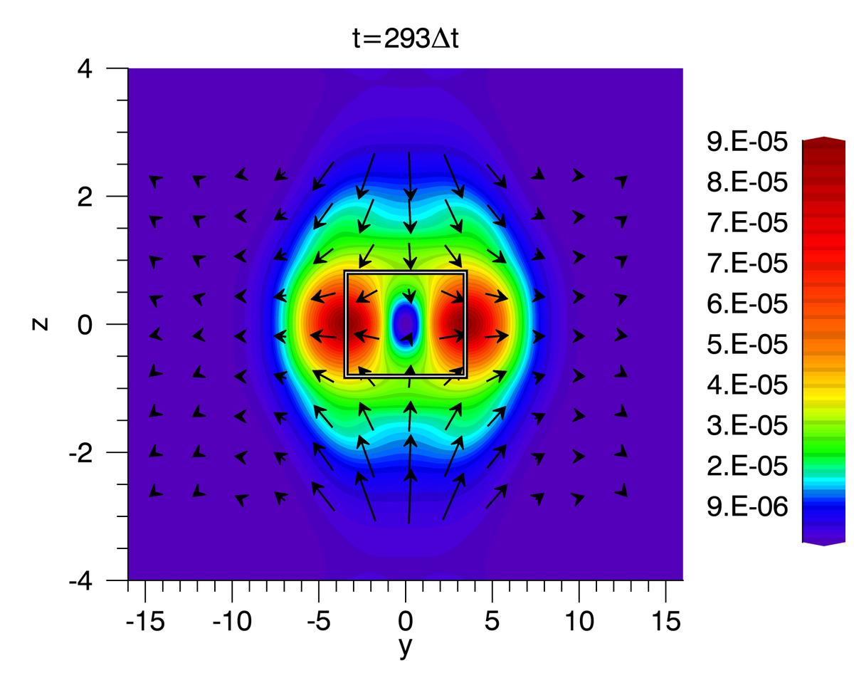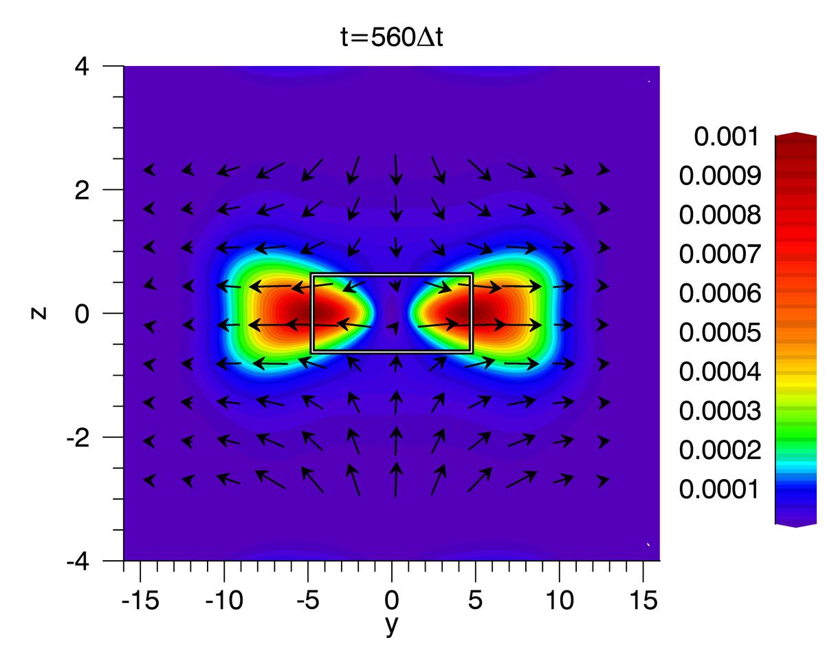 Advection-dominated phase shown in kinetic energy at times 293Δt, 434Δt and 560Δt for the coronal atmosphere. The white box frame denotes the reconnection region.