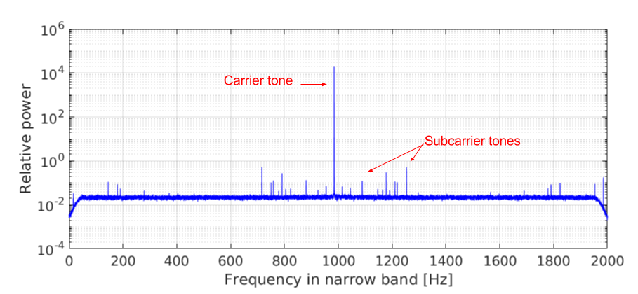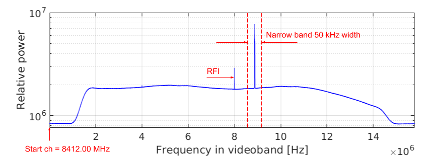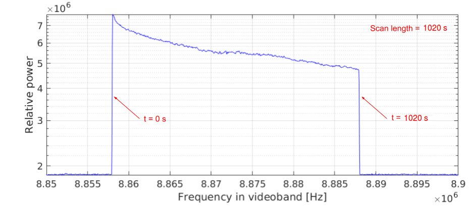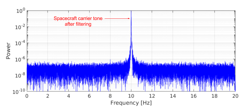 Example of Doppler data processing pipeline using observations of MEX during Phobos flyby by Hartebeesthoek (see Sect. 3). Panel a shows the typical resulting average power spectrum of a scan after running the SWSpec software. In the 16 MHz pre-defined sub-band starting at 8412 MHz, the spacecraft signal is found in the spectrum. A narrowband containing the moving phase of the spacecraft carrier/tone is selected (in this case of 50 kHz bandwidth) to model the Doppler shift using an n-order polynomial frequency fit. Panel b shows a zoom of the spectrum inside the selected narrowband window to perform the fit. Here the moving phase of the carrier tone is visible along the duration of the scan. After the fit is performed, SCtracker applies the polynomial coefficients after converting the sample to the baseband sample to stop the moving phase of the tone. In this way, SCtracker extracts an initial fit of the Doppler shift. Panel c shows the output of the SCtracker, which is a phase-stopped filtered out signal in a 2 kHz narrowband in baseband. Finally, the dPLL performs high-precision iterations of the time integration of the overlapped spectra, phase polynomial fitting, conversion to baseband, and phase-stopping corrections, using narrowband windows around the carrier tone. The iterations stop when the window bandwidth reaches 20 Hz, as shown in panel d, allowing the extraction of the frequency and phase residuals of the spacecraft carrier tone with a 2 mHz frequency spectral resolution.