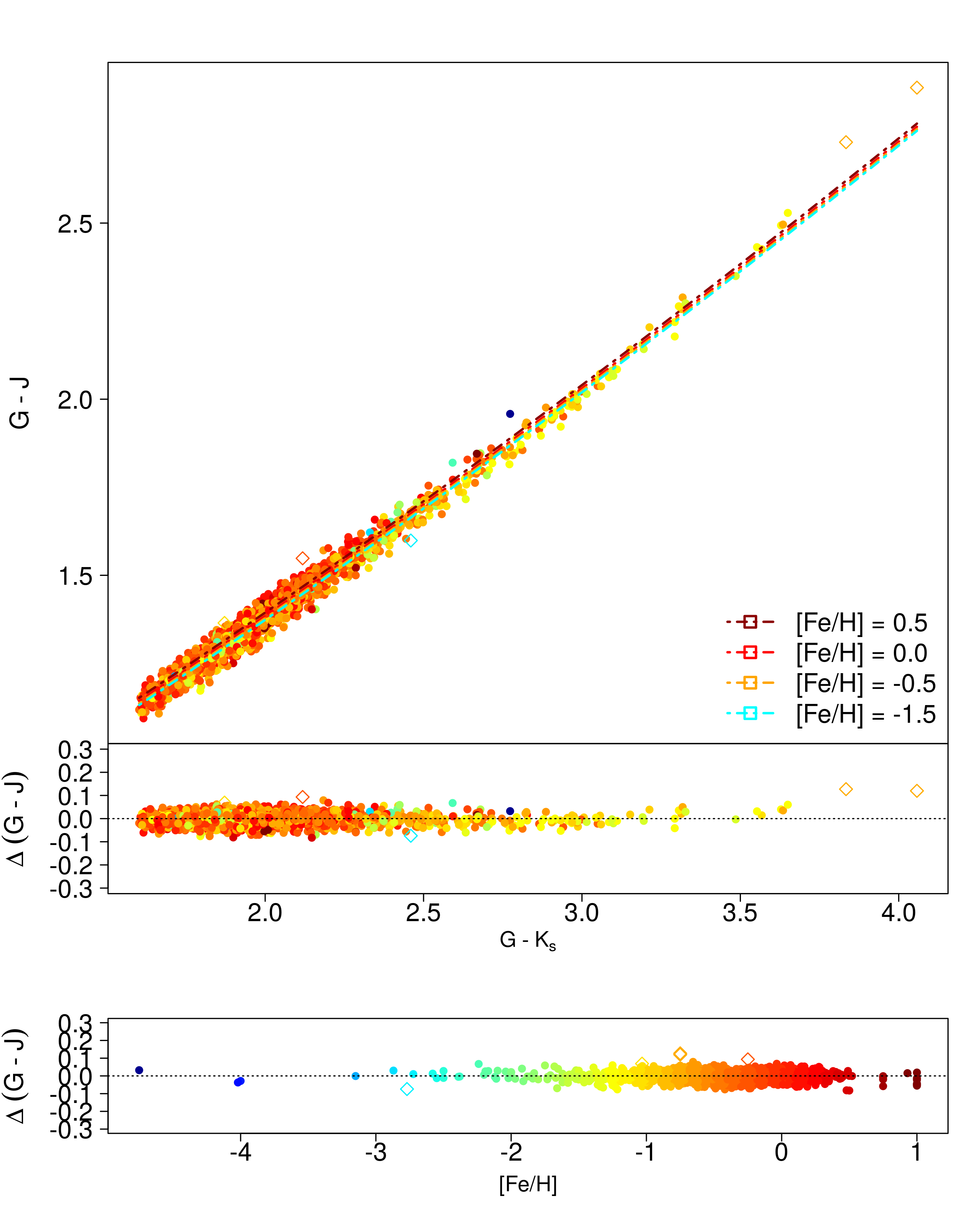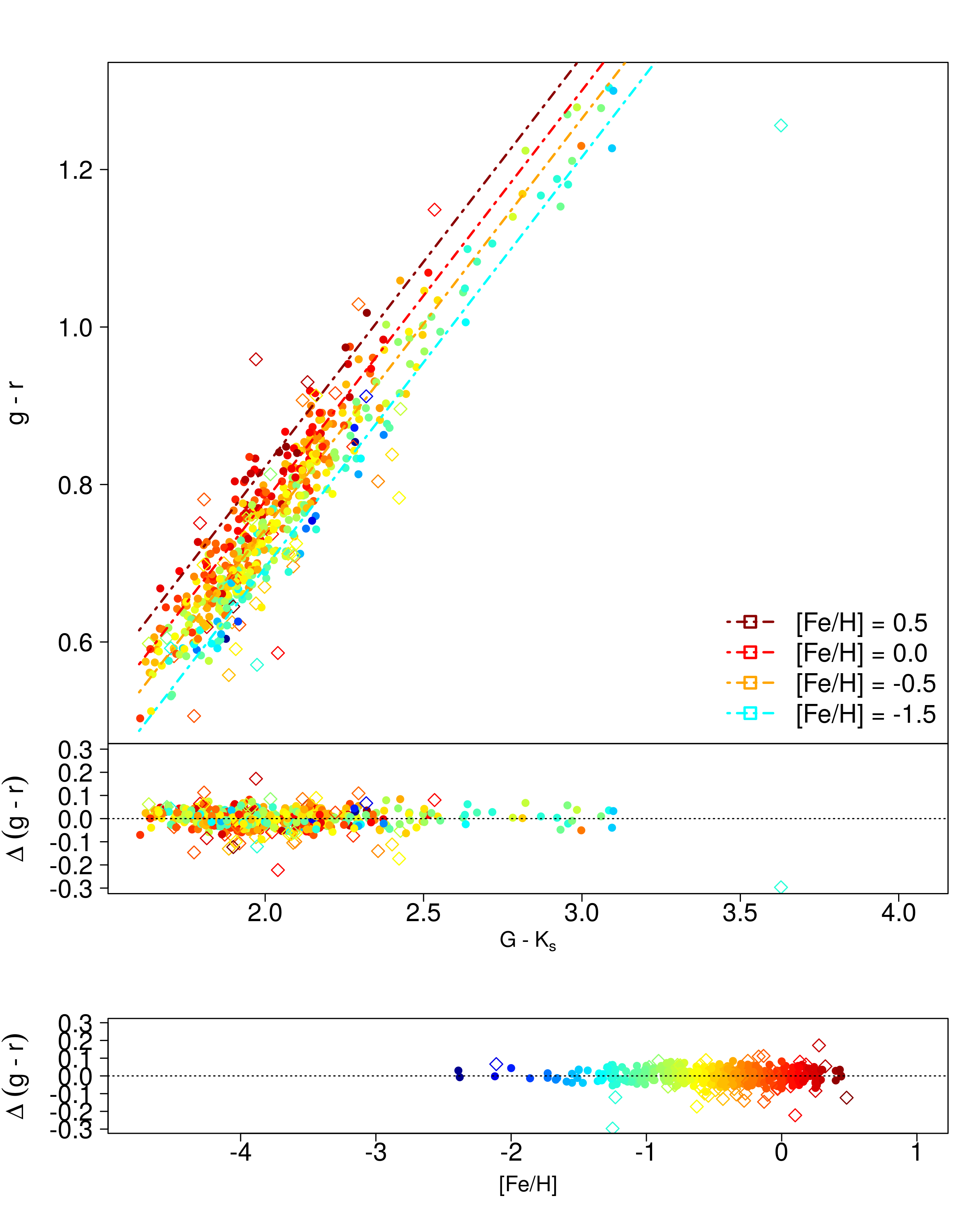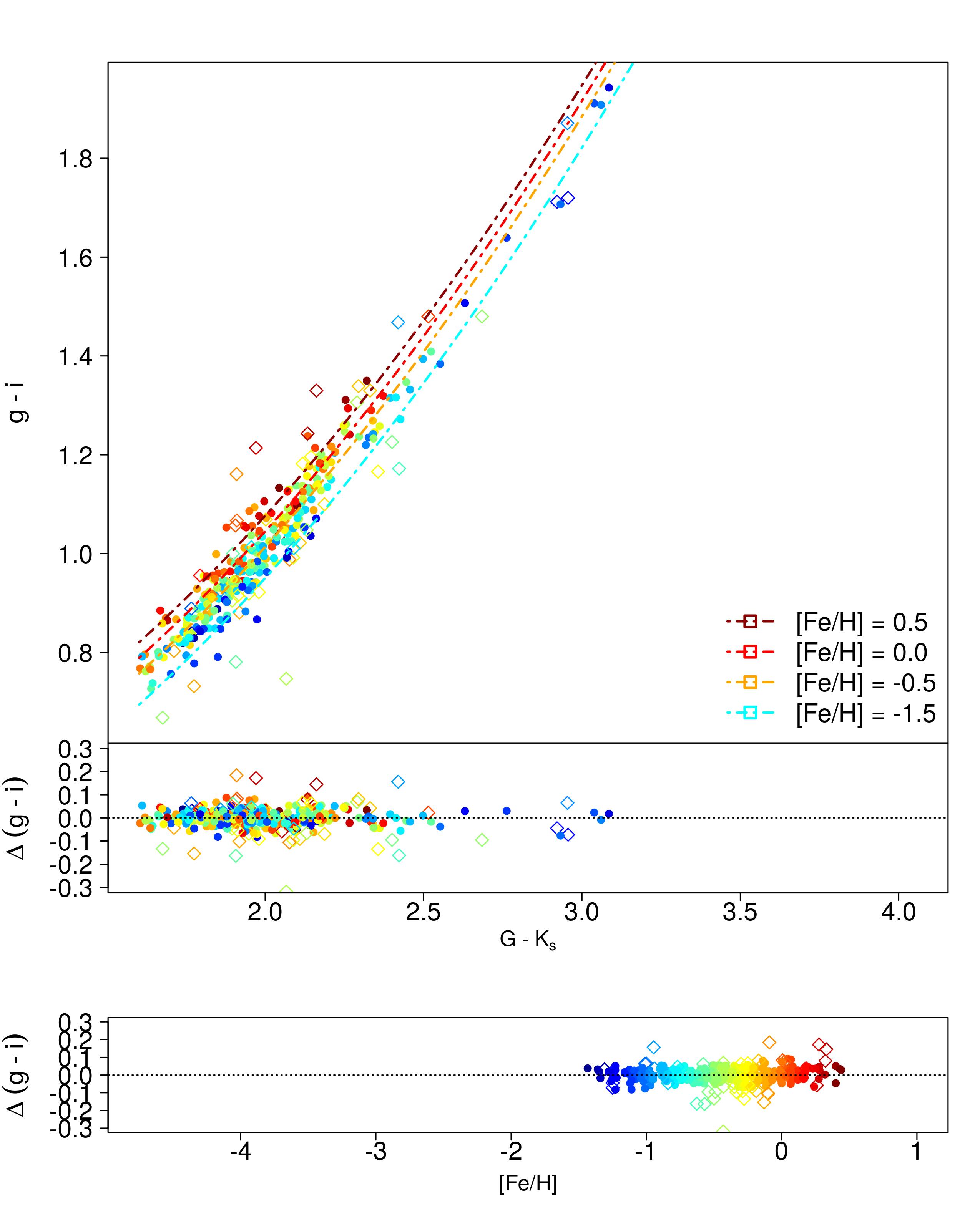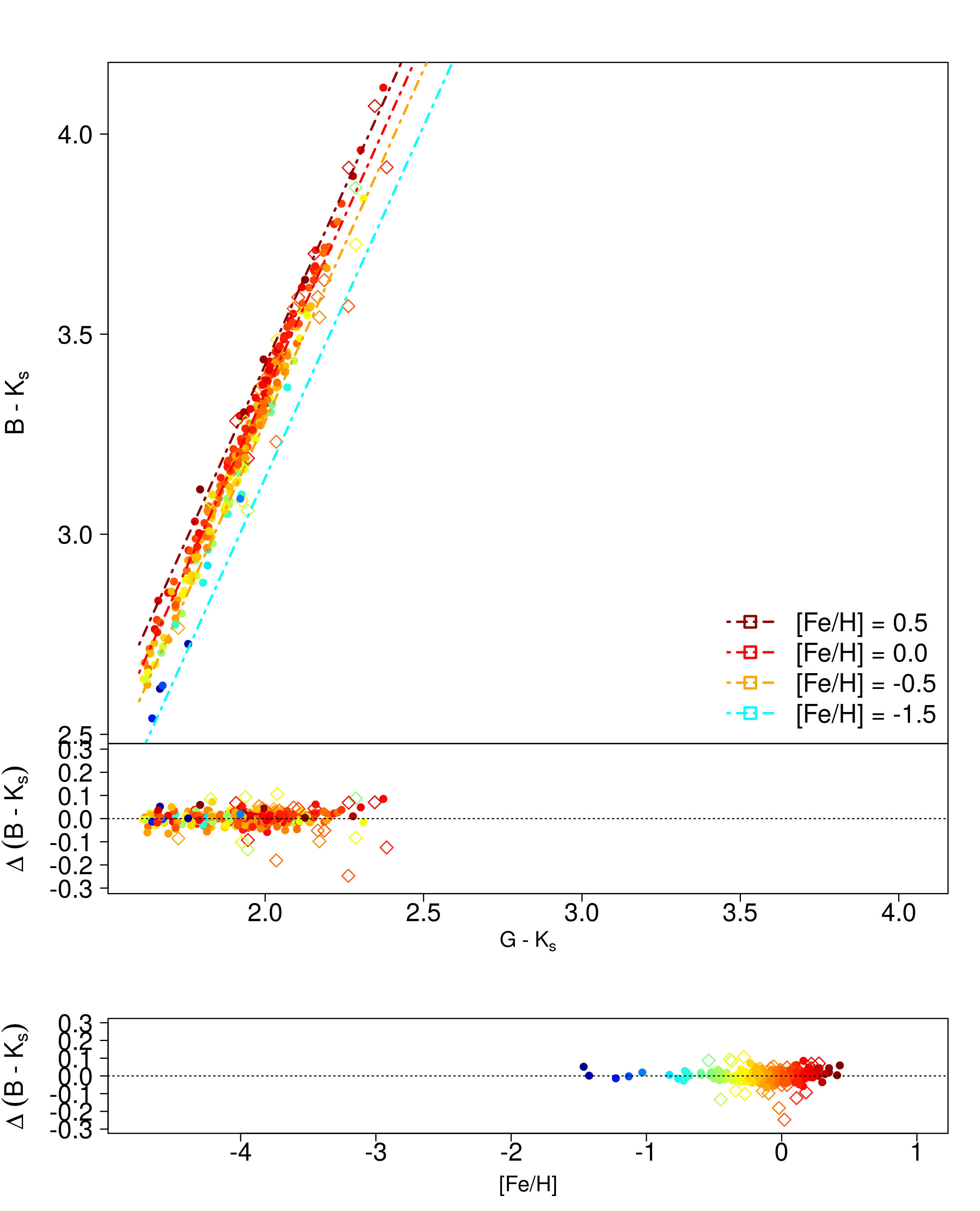 Empirical colour vs. G−Ks calibrations for B−Ks, G−J, g−r and g−i colour indices. The dash-dotted lines correspond to our calibration at fixed metallicities (see legend). The colour of the points varies as a function of the metallicity. Diamonds correspond to the outliers removed at 3σ during the MCMC process. At the bottom of each calibration plot the residuals of the fit as a function of G−Ks and [Fe/H] are shown. All plots are scaled to the same G−Ks colour and metallicity intervals.