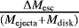 Mass (ejecta plus disk) gravitationally bound to the secondary star, ΔMMS, and to the white dwarf, ΔMWD, and total mass leaving the binary system, ΔMesc, together with their fractions (in %) over the total ejecta plus disk masses, after collision with the nova ejecta. The parameter Δ MMS,lost is the mass lost by the main sequence star in the interaction with the nova ejecta.