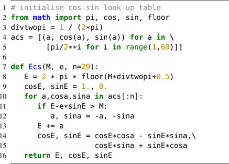 It can be also instructive to count the number of floating point operations. In Appendix A we see five multiplications, four additions, and one comparison in each iteration. For single precision this must be executed 29 times. On the other hand, a Newton iteration in Eq. (2) has one division, two multiplications, four additions, and one sine and cosine term. In case the latter two terms are computed via Taylor expansion to 17th order and with a Horner scheme, each will contribute additional nine multiplications and nine additions. Furthermore, the cosine and sine routines have to check the need for range reduction each time. Actually, also an additional final sine and cosine operation should be loaded to Newton’s methods, since sin E and cos E are usually needed in subsequent calculations.