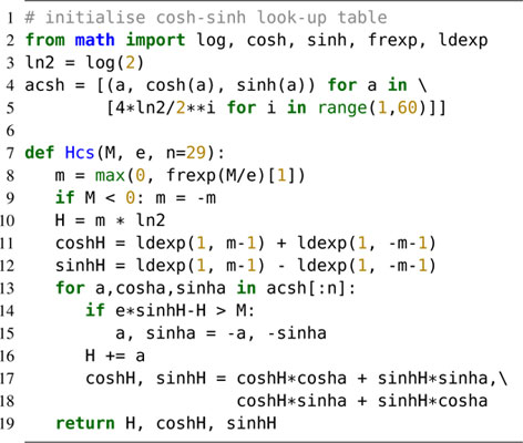 In Appendix A we provide a short python code which implements the algorithm described in this section. A slightly more elegant formulation is possible with complex numbers zn = exp(iEn) = cos En + i sin En and an = exp(iαn)=cos αn + i sin αn. Then Eq. (12) becomes zn + 1 = an + 1zn or depending on σn and in Eq. (6) the substitution