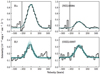 Fig. 7. Hα and [NII] emission line intensities as a function of the velocity for the three clumps. The zero velocity corresponds to the redshift obtained with the Hα emission line from the integrated spectrum. The 1000 realizations obtained with the Monte Carlo simulation are shown in blue and the final result is shown in black. |