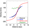 Fig. 5. Rotation curve extracted on the major axis of the velocity maps. The black squares and the blue line represent the curve extracted from the observed velocity map and velocity map from the model, respectively. The red line shows the intrinsic rotation curve from the model, corrected for inclination. The green diamonds represent the velocity dispersion profile. |