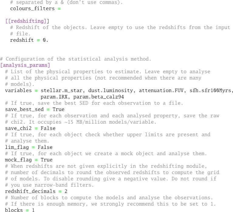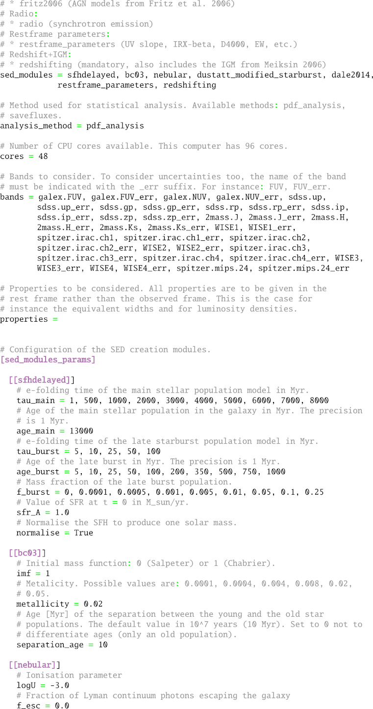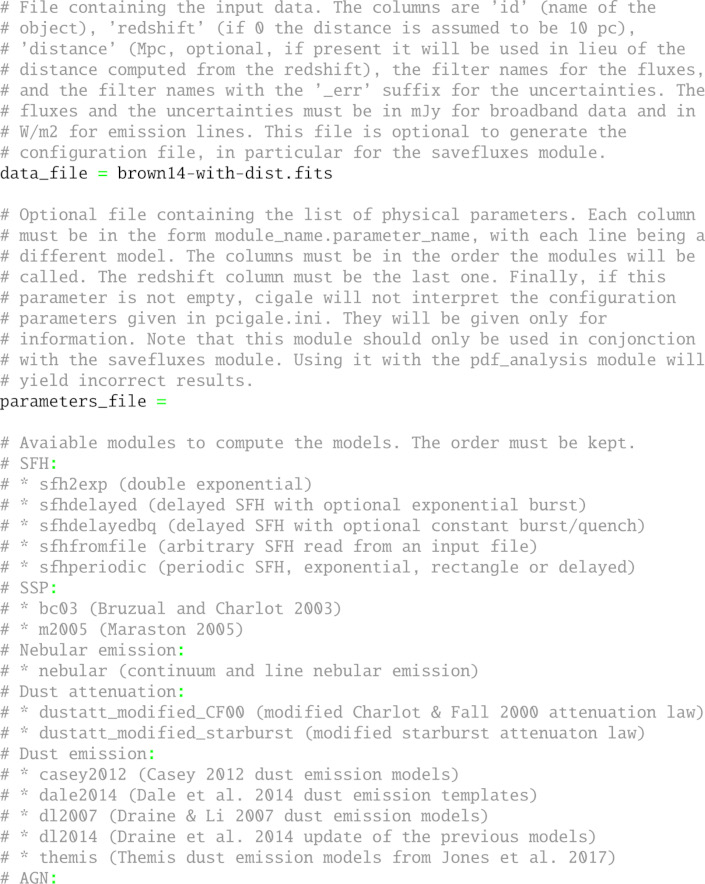 Input handling. First the configuration file is read and interpreted: name of the input data files, number of cores, fluxes and properties to fit, parameters for each module, and so on. Then the input data for each object to be analysed are also read: names, redshifts, distances (optional)2, fluxes, and physical properties (optional). These data are then processed and normalised (e.g. eliminating invalid data, adding missing uncertainties, etc.). If CIGALE is only used to generate models, the data file is only used to extract the list of bands.