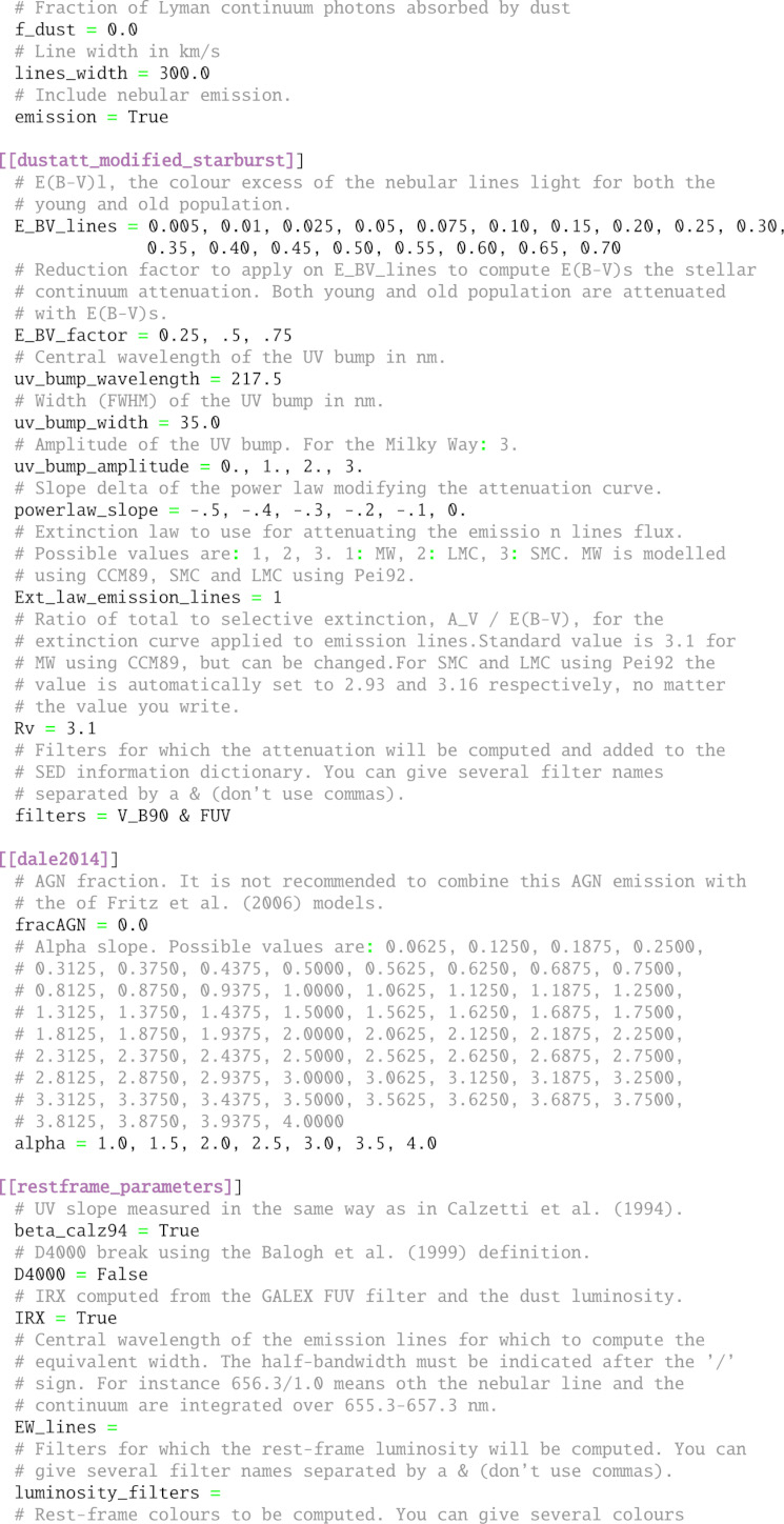 We also store intermediate SED in cache to avoid having to compute each model from scratch. For instance the cache can contain an SED built with steps 1–6 (that is the full model but without redshift); steps 7 and 8 can then easily be applied to compute the flux at different redshifts without computing steps 1–6 again. Because SED objects can be particularly voluminous, they contain the full spectrum for each of the physical components, intermediate SED that are no longer of use to construct new SEDs are discarded. This is the case for instance for an SED that corresponds to an SFH not used by any of the models still to be computed. The models are computed in an order designed to optimise the efficiency of the cache. In practice at any given time it only contains a small number of intermediate SEDs necessary to ensure the full speedup, maximising cache lookup speed and minimising memory usage.