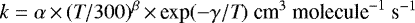 Notes. Definition of α, β, γ, F0, g can been found in Wakelam et al. (2012, 2010): , T is the temperature and ranges between 10 and 300 K except for some cases (noted).