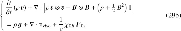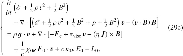 ![$$ \begin{aligned} \left\{ \begin{aligned}&\frac{\partial }{\partial t} \left( \fancyscript {E} + \tfrac{1}{2} \, \rho \, v^2 \right) + \nabla \cdot \left[ \left( \fancyscript {E} + \tfrac{1}{2} \, \rho \, v^2 + p \right) \, \boldsymbol{v} \right] = \rho \, \boldsymbol{g} \cdot \boldsymbol{v}\\&\qquad \qquad \qquad \qquad \qquad + \frac{1}{c} \, \chi _{0R} \, \boldsymbol{F}_{0} \cdot \boldsymbol{v} + \, c \, \kappa _{0P} \, E_{0} - L_{0}, \end{aligned}\right. \end{aligned} $$](/articles/aa/full_html/2019/11/aa35991-19/aa35991-19-eq44.gif)