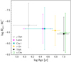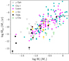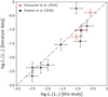 Fig. 2. Comparison between our L⋆ estimates (see Sect. 3.1.1 and Table 2) and values reported by Ducourant et al. (2014, red symbols) and Kastner et al. (2016, black symbols), corrected for difference in distance between our adopted values and values listed in those references for individual objects. The error bars trace the individual uncertainties associated with the L⋆ values in the compilation of Ducourant et al. (2014), and a typical uncertainty of ±0.2 dex in the other cases, for illustration purposes. The identity line is dashed in gray to guide the eye. |