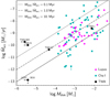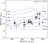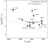Fig. B.3. Measurements of log g for TWA stars with disks (this study, black dots) and without disk (Stelzer et al. 2013, gray diamonds), as a function of their Teff, both derived with ROTFIT. Empty symbols identify objects with disputed membership to the TWA in Gagné et al. (2017). PMS isochrones from Baraffe et al.’s (2015) model grid are overlaid as blue dotted lines for comparison purposes. |