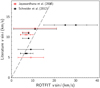 Fig. B.2. Comparison between our ROTFIT estimates of v sin i and values reported by Jayawardhana et al. (2006, red symbols) and Schneider et al. (2012, black symbols) for objects in common. Upper limits are marked by arrows. The equality line is traced in gray to guide the eye. |