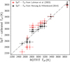 Fig. 3. Comparison between Teff estimates derived with ROTFIT for all targets and spectra, and Teff values corresponding to estimated SpT for each source (Table 2) using Luhman et al. (2003, red symbols) and Herczeg & Hillenbrand (2014, black symbols) calibrations. The x-axis uncertainties are those derived from the fit; the y-axis uncertainties correspond to half the difference in Teff between consecutive spectral subclasses in the corresponding SpT–Teff scale. The identity line is dashed in gray to guide the eye. |