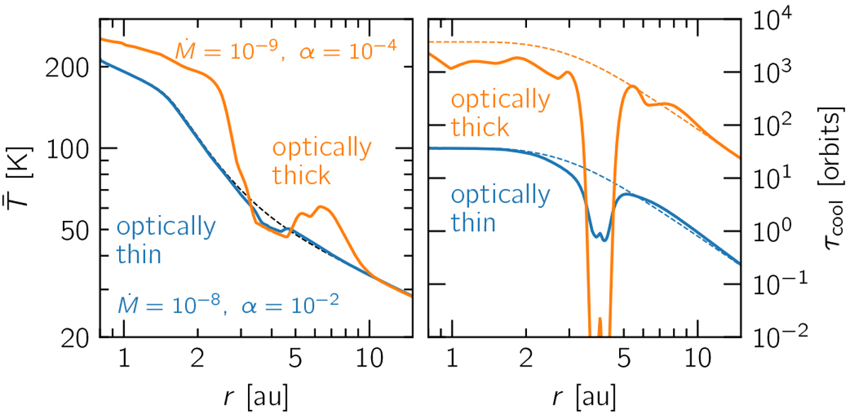 Azimuthally-averaged temperature and cooling timescale for two models that share the same initial temperature profile but have very different optical depth profiles. We see that shock heating is significantly stronger for the optically thicker model, while the optically thinner one looks almost unchanged.