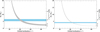Fig. A.5. Mass of the secondary component as a function of the orbital inclination io: primary masses M1 of 1.1 ± 0.5 M⊙ (left panel; see Table A.2) and 0.315 ± 0.015 M⊙ (right panel; see Fig. A.6) are used to numerically solve Eq. (1) for M2. The width of the gray shaded region reflects all 1σ-uncertainties. The y-axis on the right-hand-side shows the luminosity of a zero-age main sequence (ZAMS) star with mass M2 based on evolutionary tracks for nonrotating stars of solar metallicity (Ekström et al. 2012). The light-blue shaded horizontal bar represents the inferred luminosity of the visible B-type primary, log(L1/L⊙). For high orbital inclinations, a relatively unevolved low-mass MS companion could be outshined by its primary by more than one (right panel) to almost two (left panel) orders of magnitude, which could be faint enough to avoid imprints in the observed spectrum. |