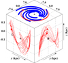 Fig. A.7. Three-dimensional orbit of LS V+22 25 in a Galactic Cartesian coordinate system in which the Galactic center (marked by a black +) lies at the origin, the Sun (marked by a black ⊙) is located on the negative x-axis, and the z-axis points to the Galactic north pole. The nine trajectories (red lines; arrows indicate the star’s current position) illustrate the effects of uncertainties in the parallax and proper motions from Gaia, and in the systemic radial velocity from Liu et al. (2019). These were computed back in time for 200 Myr using a standard three-component, axisymmetric model for the Galactic gravitational potential (see Irrgang et al. 2013 for details on the Milky Way mass model and on the orbit computations). The shape of the orbit (prograde, almost circular, small vertical oscillations) is typical for a thin-disk star (see, e.g., Pauli et al. 2006 for details on the properties of different kinematic groups). The thick blue solid lines schematically represent the loci of the spiral arms based on the polynomial logarithmic arm model of Hou & Han (2014). Interestingly, the current position of the star seems to be aligned with the Perseus spiral arm, which could be a possible sign of youth. |