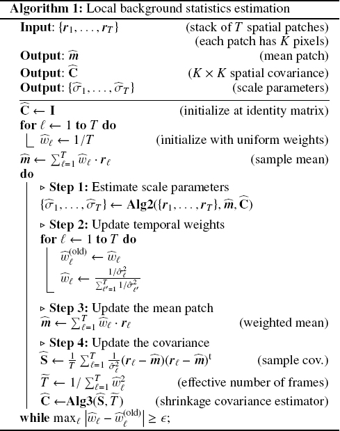 Estimating, at each spatial location, the mean background m, the spatial covariance C, and the scale parameters σ1 to σT is very close to the problem of covariance structure estimation in radar under a compound-Gaussian clutter model (Pascal et al. 2008). There are two differences: (i) in radar the signal and covariance matrices are complex-valued; and (ii) the mean value is zero.
