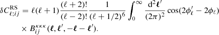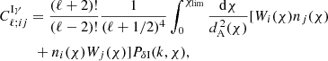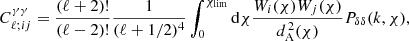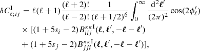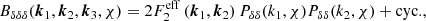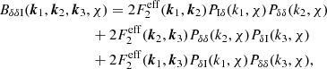 As in Scoccimarro & Couchman (2001), this can then be modified to include numerical fitting to N-body simulations by exchanging F2 for , as defined in Eq. (17). The fitting formula determined in Scoccimarro & Couchman (2001) still remains valid, because it does not have any redshift dependence and does not depend on the fiducial cosmology. The density perturbation-IA bispectrum, used in the IA-enhanced lensing bias correction, is then a specific case of this formula, where μ = ν = δ, and η = I.