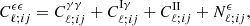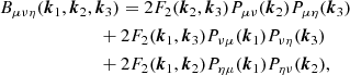 We can extend the methodology used to describe the matter bispectrum, Bδδδ, to describe the bispectrum of three related quantities, Bμνη. Here, the three fields μ, ν, and η are proportional to the density contrast, δ, by some redshift-dependent weightings. This means they behave as δ would, under a small change in the fiducial cosmology. In this way, the second-order perturbation theory approach of Fry (1984) remains valid. We also assume Gaussian random initial conditions. Accordingly, the bispectrum is defined by first and second-order terms: