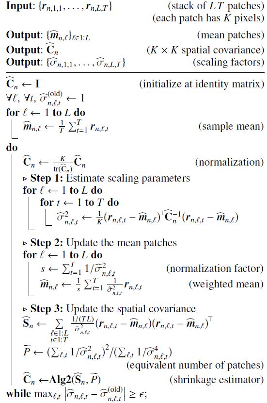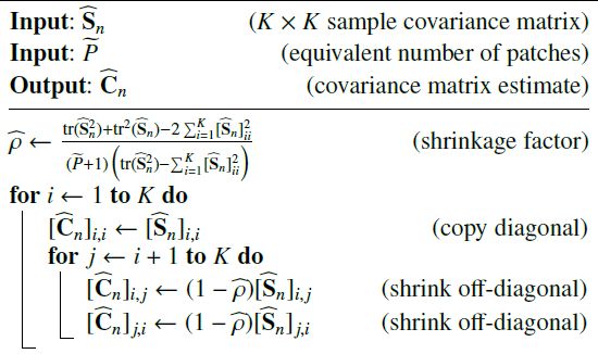 For locations θn outside of the central region of the field of view, some patches rn, ℓ, t fall outside of the measured area for the largest wavelengths. In that case, the sum for the computation of Sn in the System (3) and in Algorithm 1 is restricted to the wavelengths ℓ for which the patch is measured and the normalization factor 1/TL is corrected to match the actual number of terms in the sum. Given the severe reduction in the number of patches actually used close to the borders of the field of view, it is important to regularize the sample covariance to reduce the estimation variance and to prevent obtaining singular or ill-conditioned matrices. As in Flasseur et al. (2018a), we use a shrinkage estimator, implemented according to Algorithm 2. Because of the weighting by factors , some patches have more importance than others and an equivalent number
