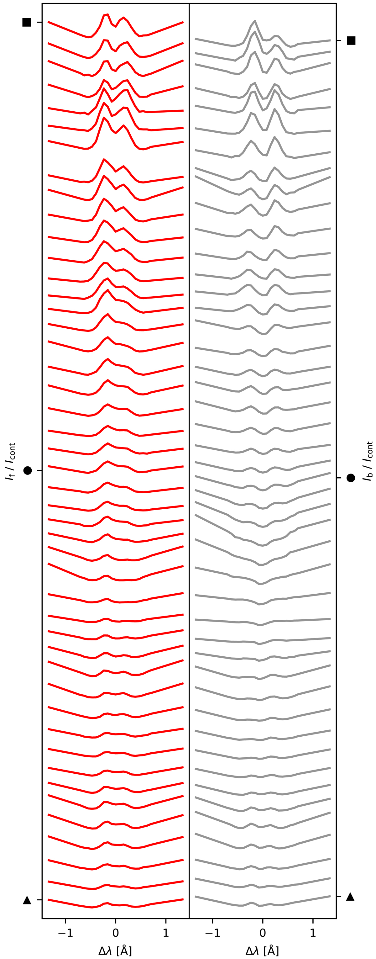 Ca II K intensity profiles at the pixels on the fibril marked in the top-right panel of Fig. 2 (left) and the its background (right); The square, circle and triangle symbols mark the head (close to magnetic concentration), midpoint and the tail of the structures, respectively.