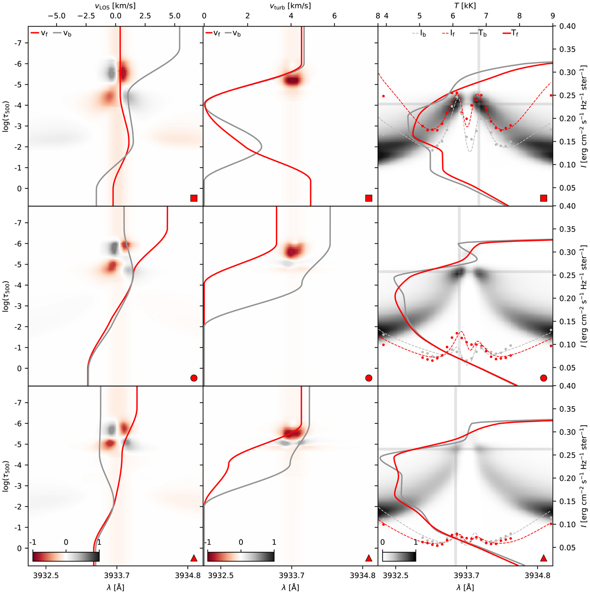 Normalised response function of the Ca II K line to the perturbations in vLOS (left), vturb (middle) and T (right) for the three points along the fibril shown in Fig. 11; the head (top row), midway (middle row) and tail (bottom row) point of the fibril are marked with a circl, square and triangle as in Figs. 4 and 11. The inferred atmospheric quantities are shown with a red solid curve for the fibril, and a grey solid curve for the background lane. The observed intensities are shown with red and grey filled circles in the right column, and the fitted line profiles are shown with dashed curves. The vertical and horizontal grey narrow bands mark the wavelength point and the continuum optical depth at which the temperature response function close to the line core has a maximum.