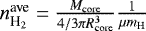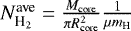 , where Mcore is the estimated core mass (Col. 7), Rcore the estimated core radius prior to deconvolution (Col. 6), and μ = 2.8. (13) Average column density calculated in the same way as for Col. 12 but using the deconvolved core radius (Col. 5) instead of the core radius measured prior to deconvolution. (14) Beam-averaged peak volume density at the resolution of the 500 μm data, derived from the peak column density (Col. 11) assuming a Gaussian spherical distribution: