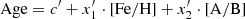 Notes. Coefficients c, x1, and x2 of the relations [A/B] = c + x1 ⋅ [Fe/H] + x2 ⋅ Age, where [Fe/H] and age are the independent variables. Δc, Δx1, and Δx2 are the uncertainties on the coefficients. c′, , and