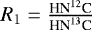12C/13C ratios predicted for HNC and HCN in the range of temperatures and densities of the high-mass star-forming regions sample observed by Colzi et al. (2018a) (Cols. 2 and 3).