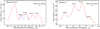 Fig. 4 Median radial column density (a) and dust temperature (b) profiles measured on the eastern and western sides of filament 10 (green and red solid lines, respectively). The median FWHM derived from the filament profile in panel a is 0.1 ± 0.03 pc. The column density profile is somewhat wider on the western side, presumably because of the effect of YSO outflows on this filament. The background level, which was measured on the eastern side (at >0.1 pc, ~ 3.5 × 1021 cm−2), is marked with a blue-dashed line. |