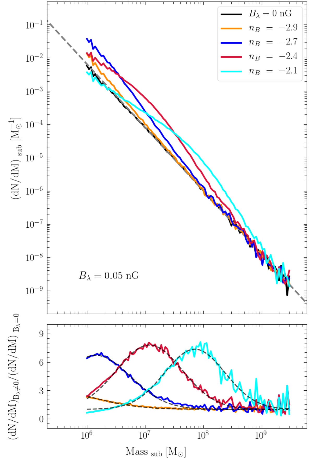 Halo mass function. The halo mass is calculated within R200. The count of halos is shown per logarithmic mass interval for different slope indexes nB with a constant magnetic field strength, Bλ = 0.05nG. The dashed gray line shows a power law dN/dM ∼ M−1.96 fitted to the unperturbed power spectrum. The bottom panel shows the ratio of the halo mass function of each PMF model to the unperturbed model. The dashed lines correspond to the fit given by Eq. (12).